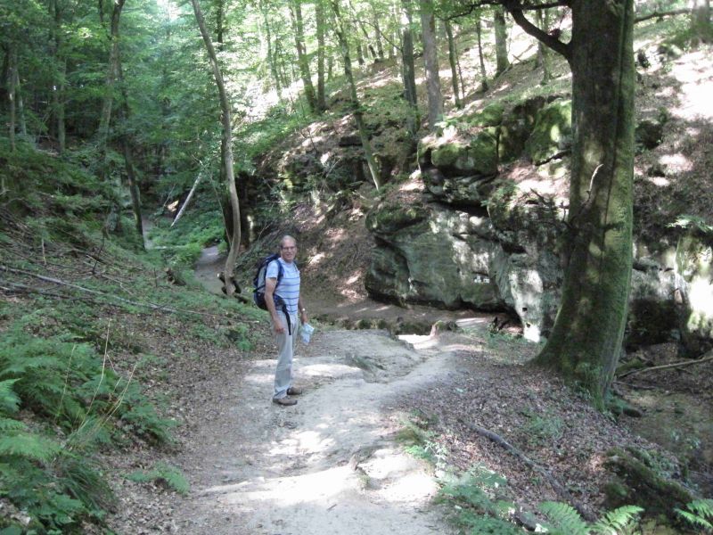 Vanmorgen is het voornamelijk bewolkt maar de temperatuur is goed. We kunnen dus buiten ontbijten. Mede omdat we op onze plek niet zoveel privacy hebben stel ik het windscherm zodanig op dat er een afgeschermde hoek ontstaat. Vervolgens haal ik de buitenkeuken te voorschijn en koppel het gas aan. Inmiddels heeft Aukje het ontbijt op orde en kunnen we buiten aan tafel. Na het ontbijt maken we het plan voor vandaag. Het wordt een rondwandeling waarbij we door het Müllerthal naar Echternach lopen en via een andere route weer terug. We vertrekken tegen twaalf uur vanaf de camping en wandelen eerst het dorp door naar het aansluitpunt waar de eigenlijke wandeling begint, het amfitheater Hohllay. Hier werden vanaf de middeleeuwen tot aan de negentiende eeuw molenstenen gewonnen. De totale wandeling staat voor 12 km op de borden maar met de aanlooproutes en het verkennen van Echternach erbij wordt het ruim 15 km.