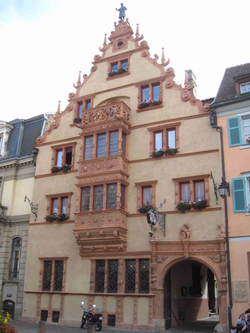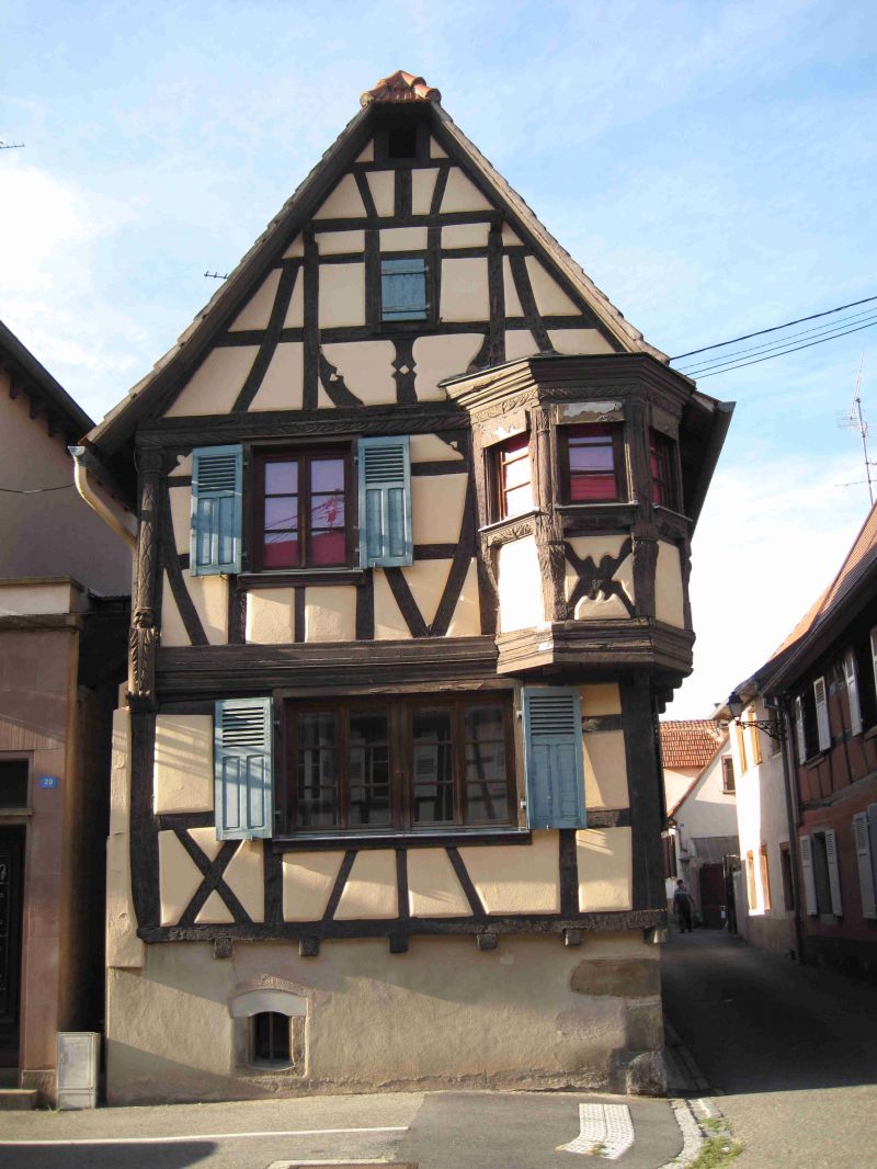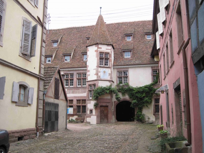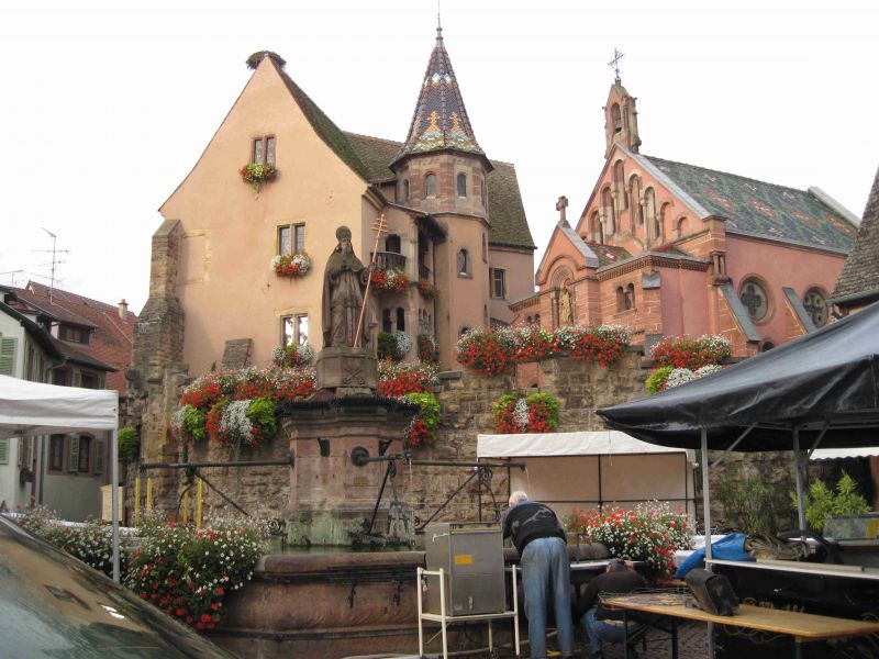 Omdat we het stadje Equisheim nog weinig hebben gezien heeft Aukje het plan opgevat om morgen de wekker op zes uur te zetten en dan voordat de toeristen het stadje in bezit nemen op onderzoek uit te gaan. Nadat ik van de schrik bekomen ben weet ik het plan zodanig om te buigen dat de wekker op half zeven wordt gezet. Daarna zorg ik zoals gebruikelijk voor koffie op bed en vervolgens ontbijten we. In de praktijk komt het er op neer dat we ’s morgens om kwart over acht het stadje in lopen. We staan nog even stil bij het idee dat Riet en Kees elke zaterdagmorgen om deze tijd al in Alphen lopen rond te darren. Equisheim wordt net wakker en we zien mensen met brood onder hun armen bij de bakker vandaan komen. Even later dienen ook de vroege vogels onder de toeristen zich aan. We hebben echter toch nog goed de gelegenheid om foto’s te maken. Equisheim doet een beetje aan Riquewihr en Obenai denken. Een prachtige oude komvormige binnenstad met straatjes die nog onaangetast lijken. Alleen is het hier nog kleinschaliger en meer pittoreske dan in Obernai. Midden door het stadje loop de Grand Rue en daaromheen in een schilvorm de oude straatjes met nog de oude klinkertjes. De straatjes zijn bovendien zo nauw dat er geen auto door kan, hetgeen het middeleeuwse gevoel nog verder versterkt.