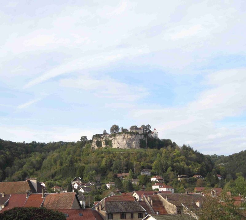 De wandeling gaat eerst naar de overblijfselen van het Chateau van Ornans dat hoog op een steile rotswand op Ornans neerkijkt. Het chateau is er niet meer maar er is wel een aantal gebouwen en ook een kapelletje waarvan de oorsprong tot 1290 teruggaat. Vanaf deze hoge plek zou je een uitstekend uitzicht over Ornans moeten hebben maar ons zicht wordt bemoeilijkt door een regennevel die het dal vult. Op de weg omhoog naar het chateau hebben we al enkele malen de paraplu moeten uitklappen en dat zal tijdens de rest van de wandeling niet anders blijken. We maken van de gelegenheid gebruik om te pauzeren in een soort bushokje en gaan daarna verder met de wandeling. We lopen eerst een stuk door het bos waar de paden hier en daar glibberig van de regen zijn geworden. Daarna gaat het langs een hoge rotswand waar je een mooi uitzicht hebt over de stad, de rivier en het omliggende gebied. We komen ook langs een groot Mariabeeld die van boven de boel in de gaten houdt. Tenslotte volgt een steile en glibberige afdaling waarna we weer in de stad uitkomen. Een leuke wandeling die ons het gevoel geeft dat we een Ornans goed op ons netvlies hebben gekregen. We scoren nog een patatje voordat we weer onze camper opzoeken. Inmiddels doet onze internetverbinding het ook weer zodat we zien dat we de eerstvolgende dagen zonnig weer tegemoet kunnen zien.