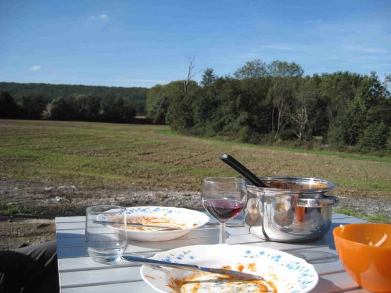 Vanmorgen worden we met zon op de camper wakker. We gaan daarom na het ontbijt een fietstocht door de omgeving maken. Het land aan de oever van de Saône is vrij vlak en half open. Ook zijn er volop kleine weggetjes waar je geen last hebt van autoverkeer. We hebben van de VVV een aantal mogelijkheden aangereikt gekregen en willen vandaag in zuidelijke richting een rondrit maken. We zijn snel buiten de stad en rijden door oude gehuchten met vaak armoedig ogende huizen. We volgende de getekende route en komen door een afwisselend landschap. Na een poosje zijn we even het spoor bijster. We moeten over een karrenspoor dat er niet echt fietsbaar uitziet. Langzaam aan wordt het duidelijk dat de route meer geschikt is voor wandelaars en mountainbikers dan voor de fietsen die wij hebben. We besluiten om de aangegeven route slechts globaal te volgen en genieten van de fietstocht. Halverwege stoppen we langs de kant van de weg en installeren de camping-gaz branders om het warme eten te maken. We hebben alle ingrediënten voor de Ras el Hanout in de fietstassen meegenomen en peuzelen ons eten zittend op onze platte kont op. We vervolgen de fietstocht richting de rivier en zien dat er verder geen mogelijkheid is om via een weg verder te gaan. Dan maar een paar tracks volgen en de goede richting aanhouden. Na een paar maal proberen komen we toch in het volgende dorp en kunnen uiteindelijk onze tocht afronden. Al met al een uitdagende en leuke tocht waar we de hele middag zoet mee zijn geweest. ’s Avonds is het rustig bij onze camperplek, nou ja op een groepje Jeux de Boulers na die aan de overkant van de weg zich uitleven.