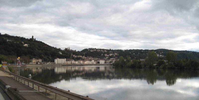 De morgenstond heeft dus niet altijd goud maar soms ook water in de mond. We eten het ontbijt buiten in ons T-shirt en verbazen ons over de aangename temperatuur. Tegen de tijd dat we gereed zijn voor vertrek is het echter alweer een ander verhaal. Eerst spetteren en daarna stevige regen doen ons op de parkeerplaats bij de supermarkt besluiten om koffie te drinken en de bui af te wachten voordat we wegrijden. Zodra de koffie op is gaan we toch op pad en na een kwartiertje rijden is het droog en ziet de omgeving er al weer vrolijker uit. Het is een genot om het landschap vanuit de camper aan ons voorbij te zien glijden en we hebben dan ook geen spijt dat we voor het rijden op de binnenwegen hebben gekozen. De keerzijde is wel dat we om de haverklap dwars door een dorpje of stadje moeten en er dus ook flink aan het stuur moet worden gedraaid. Na ongeveer een uurtje rijden zien we een Aldi opdoemen en besluiten terstond om te stoppen. Bij de Carrefour had men niet alles en we hebben nu ook de kans om een paar boodschappen die we vergeten waren te kopen. Het is erg rustig bij de Aldi en het ruime parkeerterrein is nauwelijks bezet hetgeen ons er toe brengt om tevens het de warme maaltijd daar te bereiden/nuttigen. De buitenkeuken is zo neergezet en we zitten heerlijk in het zonnetje te eten en uit te buiken. Even na vier uur rijden we verder richting Lyon. Aanvankelijk zag het er naar uit dat we met de Route Nationale dwars door Lyon zouden gaan maar we worden er gelukkig toch omheen geleid. We rijden een stuk langs de Rhône en na een korte file in het stadje Vienne arriveren we rond half zeven in St. Désirat. Aan het begin van het dorp vinden we de camperplaats op het parkeerterrein van een distilleerderij/museum. Een groot bord maakt ons duidelijk dat we voor 1 nacht mogen blijven staan maar daartegenover staat dat er gratis stroom, water, WC en afvalverzameling ter beschikking wordt gesteld. We stallen de camper en gaan te voet het dorpje verkennen hetgeen een leuke wandeling wordt bij een heerlijk temperatuurtje. Als we terugkomen heeft zich nog een andere camperaar naast ons opgesteld. We proberen of we TV ontvangst kunnen krijgen hetgeen er toe leidt dat we een aantal plekken op het parkeerterrein moeten uitproberen voordat we succes hebben.