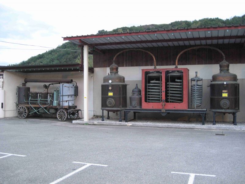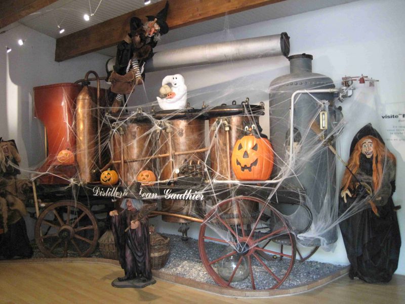 Vanmorgen schijnt de zon, en niet alleen letterlijk want we kunnen ook gebruik maken van een prachtige picknickplaats in het parkje naast het parkeerterrein. Heerlijk in de zon buiten ontbijten hetgeen er normaal op een camperplaats niet in zit. Na het ontbijt koppelen we de camper van de elektriciteit af en gaan we het museum van de distilleerderij bekijken. Musee l’Alambic is gefinancierd door de Eau-de-Vie fabriek van Jean Gauthier waar men drankjes in allerlei smaken maakt. Nu heb ik geen verstand van drank dus zal ik daar verder geen oordeel over geven. Wel wordt duidelijk dat het museum dat gratis te bezichtigen is heel leuk is opgezet. Natuurlijk wordt getoond hoe men vroeger door het land trok om ter plaatse de drank te stoken. Een beetje zoals de dorsers vroeger bij ons rond gingen. De verschillende tafereeltjes zijn leuk om te zien. Vooral voor kinderen heeft men een presentatie Halloween met de verschillende heksen en doodskoppen opgenomen. Daarna krijgt men van bovenaf een kijkje bij het afvullen van de flessen in de huidige fabriek en tenslotte kom je in de winkel waar je alle eindproducten kunt zien en natuurlijk ook kunt kopen. Wij kopen een zakje noga en een fleslimonadesiroop van prima kwaliteit.