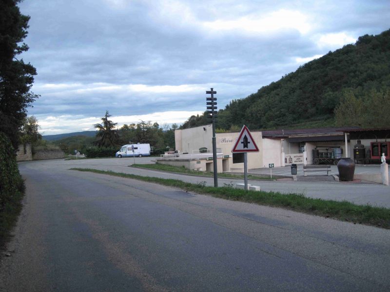 Afgelopen nacht heeft het flink geregend. Als we wakker worden is het droog maar er staat een stevige wind. Onze camping heeft, zoals op zoveel campings, geen goede verharde plekken waar je een camper kunt neerzetten. Aan het einde van het seizoen is ook het gras verdwenen zodat er een kleiachtige laag overblijft die door de regen spekglad wordt. We moeten daarom telkens goed onze schoenen schoonmaken en ook de onderkant van de tegels voor onze buitendeur zit onder de klei. Bij het wegrijden van de kampeerplek blijkt dat ook de camper moeite heeft met deze ondergrond. Steeds slippen de voorwielen door en telkens probeer ik door achteruit en een beetje opzij te sturen een plekje te vinden dat voldoende grip geeft om op het asfalt, dat op slechts twee meter afstand voor de camper ligt, te komen. Net op het moment dat ik de moed opgeef lukt het om de af slippend vast voet op het asfalt te krijgen. Door het slippen is de zijkant van de camper wel onder de klei spatten gekomen. We rijden naar het sani-station waar we het afvalwater kunnen lozen en ook drinkwater kunnen laden. Ook spuit ik de klei van de camper. Op het moment dat we wegrijden begint het te regen en dat zal gedurende de hele reis het geval blijven. We rijden door een landschap in herfsttooi. Prachtige rijen met gekleurde boombladeren begeleiden ons tijden een groot deel van de rit van vandaag. Onderweg stoppen we in Bagnols voor de boodschappen waar we tevens koffie drinken. Weer een uurtje verder stoppen we voor de warme maaltijd op een recreatieplek in het plaatsje Meysse waar we een maand geleden ook gegeten hebben. Vanaf hier is het nog zo’n 90 km naar de drankfabriek van Saint Désirat waar we om half zes arriveren. Er staan reeds twee andere campers maar ons plekje waar we TV ontvangst hebben is nog vrij. Terwijl ik de schotel richt en de walstoomkabel aansluit gaat Aukje alvast naar de drankwinkel bij de fabriek om inkopen te doen. Vanavond staan we op een rustige camperplek en het is inmiddels droog, windstil en met 15 graden niet koud.