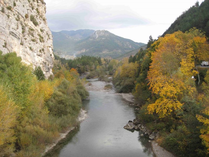 Vanmorgen maak ik een praatje met onze Duitse buurman. Hij is net terug van het VVV en heeft daar vernomen dat het vandaag zwaar bewolkt zal zijn en dat het morgen en overmorgen stevig regent waarbij de temperatuur overdag maar 8 graden is. Hij vertrekt naar het zuiden richting Perpignan. Wij zijn eigenlijk van plan om nog een paar dagen in Castellane te blijven. Het weer ziet er op het ogenblik nog goed uit, de zon probeert de ochtendmist te verdringen. In de wetenschap dat men in Frankrijk een Piet Paulusma ontbeert hakken we de knoop door en besluiten het weer af wachten, het is al vaker meegevallen. We gaan een wandeling naar het stuwmeer van Castillon te maken, volgens de folder ongeveer drie in heen en terug. We volgen de aanwijzingen en lopen eerst een klein half uur over asfalt totdat we er achter komen dat er een alternatief was