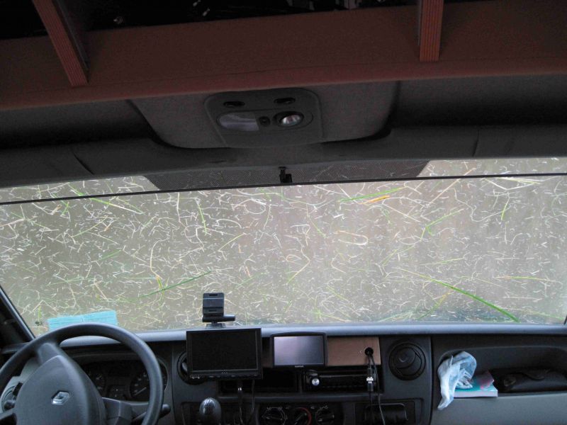 In de loop van de nacht is de wind steeds meer aangewakkerd en tegen de ochtend liggen we te schudden in bed. Het blijkt dat de oostenwind precies haaks op de camper staat en wij staan vol in de wind. Even na achten begint het bovendien te regenen en het geheel begint ons zodra we uit bed zijn snel te irriteren. We besluiten de camper een stukje te verplaatsen zodat hij met de kop in de wind komt en bovendien in de luwte van een strook met gigantische rietstengels staat. Ook daar lukt het niet om de TV mast gericht te houden omdat de rukwinden soms ook van richting veranderen. Stilaan begint het ook steeds harder te regenen en de rest van de dag blijken wind en regen elkaar te hebben gevonden en ons dwingen om binnen te blijven. Ik ga verder met de Franse les en luister daarna muziek op de mp3. Aukje houdt zich bezig met het lezen van een boek en het verrichten van schoonmaakwerkzaamheden in de camper. Tegen de avond is er even wat minder regen en wagen we ons richting het strand. Het water komt tot aan de weg en er zijn werkers bezig om de schade beperkt te houden. De avond daarvoor, toen er nog geen sprake van storm was, kletsen de golven al tegen de wanden van de strandhuisjes. Kennelijk is dit hier ook een uitzonderlijke situatie anders zou je verwachten dat men wat beter is voorbereid. In de loop van de avond neemt de wind in kracht af zodat we de schotelantenne weer op de Astra satelliet gericht krijgen. De regen houdt echter nog aan al is de hoeveelheid wel minder dat overdag het geval was.