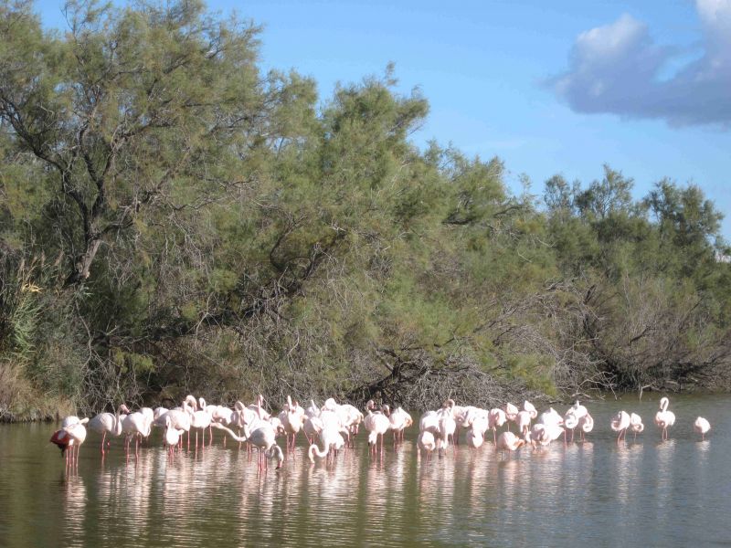 Vandaag staat een bezoek aan het vogelpark op het programma. Na een fietstochtje van zeven kilometer bereiken we het Parc Ornithologique in het gehucht Pont de Grau. Bij de kassa krijgen we een plattegrond aangeboden waaruit blijkt dat het park van in totaal 60 hectares in twee wandeltrajecten is opgedeeld. Het kortste traject voert vooral langs de kolonies flamingo’s die in de camargue in overvloed aanwezig zijn. Net na het begin van de route, als we de borden met uitleg over de verschillende soorten en hun bijzonderheden gelezen hebben, zien we een dier dat volgens ons een bever moet zijn, het pad oversteken. We lopen het genummerde pad af en krijgen ook nog verschillende andere vogels te zien waaronder een stel oehoes, maar de flamingo’s vormen toch wel de hoofdattractie. Het tweede traject voert ons vooral door mooie natuur en met de verschillende uitkijktorens krijgen we een goed beeld van het natte gedeelte van de camargue. Vogels zien hier echter nauwelijks, voor flamingo’s is het water te diep en de andere vogels zijn waarschijnlijk naar het zuiden vertrokken. Na weer een ritje op de fiets zijn we om vier uur weer terug bij de camper. Aukje heeft het warme eten al voorbereid zodat we even na vijven al aan een wandeling langs het strand naar Saintes Maries de la Mer kunnen beginnen. We lopen langs de jachthaven tot in het centrum tot aan de arena. Ja, hier doen ze ook aan stierenvechten maar op de provenceaalse wijze hetgeen inhoudt dat de stier niet het loodje legt maar dat wordt getracht een roos, die tussen de horens is aangebracht te bemachtigen. Rond half zeven, het is inmiddels donker, arriveren we weer op de camping.