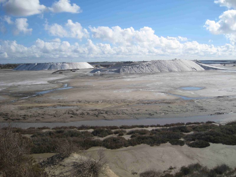 Vandaag willen we de zoutpannen gaan zien en ook een wandeling maken in een afgesloten stuk beschermd natuurgebied van de camargue. Het dorp Salin de Giraud dankt haar naam aan de zoutwinning die hier nog steeds op grote schaal plaatsvindt. Grote, met lage dijkjes afgesloten, percelen worden in de winter overspoeld met zeewater. Nadat het zeewater is verdampt schraapt men aan het einde van de zomer het neergeslagen zout van de bodem. Het zout wordt vervolgens op grote bergen als voorraad opgetast waarna het in de rest van het jaar wordt afgegraven, schoongemaakt en verwerkt. In totaal is er 25000 hectares (een kwart van het totale gebied) dat op deze wijze voor de zoutwinning wordt gebruikt. Even buiten Salin de Giraud stoppen we bij een verhoogd uitkijkpunt waar we een deel van de zoutpercelen kunnen overzien. Op dit moment is het oogstseizoen voorbij en pas in de winter zal de zee de percelen weer volop onder water zetten.