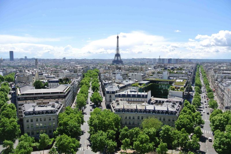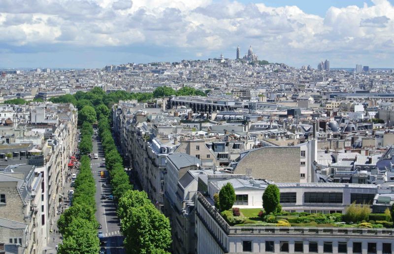 Voor Aukje is het de eerste maal dat zij in Parijs komt dus mag ik een beetje voor gids spelen. We hebben besloten om vandaag een rondwandeling door het centrum te maken om de sfeer van de stad te proeven. Het is al rond een uur als we uit de trein stappen bij station Charles de Gaulle-Etoile. Bovengronds gekomen staan we pal voor de Arc de Triomph die natuurlijk direct op de foto moet. We zien mensen hoog bovenop het bouwwerk en we besluiten hun voorbeeld te volgen. Voor 9,50 euro per persoon klimmen we de lange wenteltrap op die ons uiteindelijk naar een groot platform brengt vanwaar we met een half bewolkte lucht een prachtig uitzicht over de stad hebben.