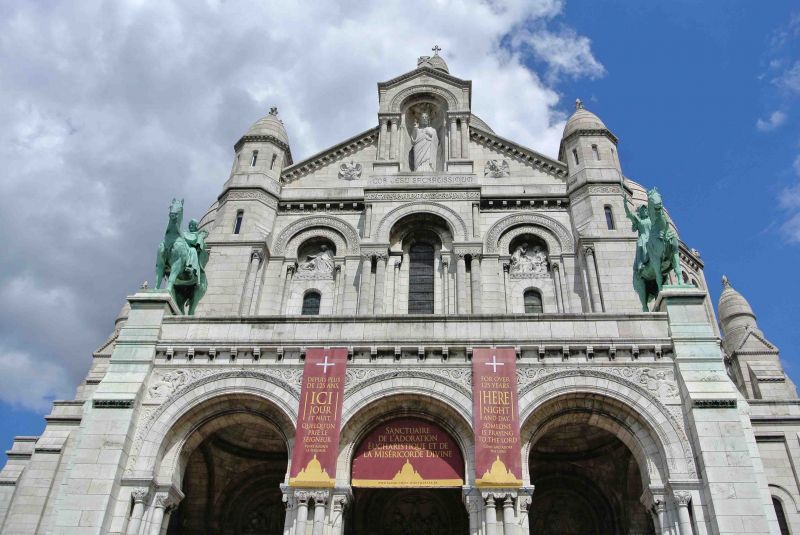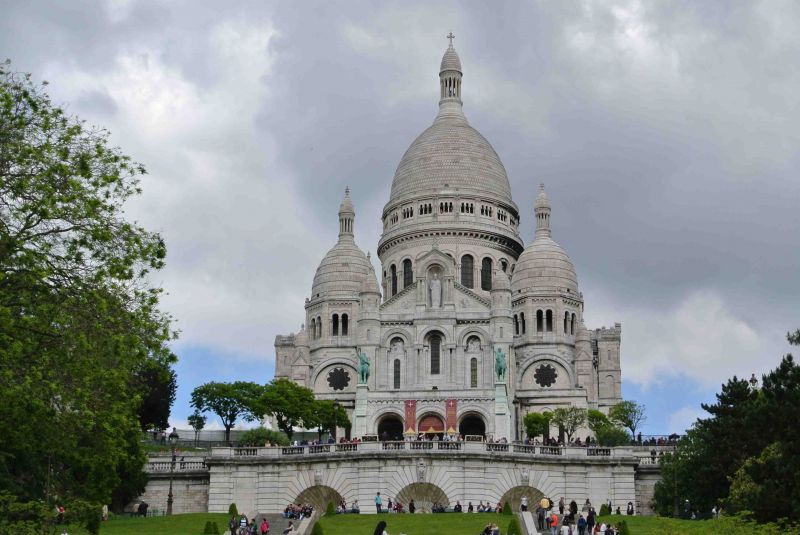 Na de lange wandeling van gisteren willen we vandaag wat gas terugnemen. Aukje heeft een aantal wandelingen van internet gedownload en voor vandaag kiezen we er een die slechts iets meer dan twee kilometer lang is. We gaan met de RER en metro naar station Anvers bij Montmartre. Via een smalle straat met vooral souvenirwinkels komen we aan de voet van de heuvel waarop de Basiliek Sacre Coeur is gebouwd. We kunnen met de tandradbaan omhoog maar wij nemen de trappen omdat we niet terugschrikken voor een klimmetje. Bij de aanvang daarvan worden we opgewacht door een groepje mensen van Afrikaanse afkomst die ons op een licht agressieve manier een lintje om de arm willen knopen en daar erna natuurlijk een tegenprestatie voor willen. Bovengekomen bekijken we eerst het uitzicht vanaf de heuvel richting het centrum en kiezen daarna een bankje uit om onze meegebrachte koffie te drinken. Vervolgens bekijken we de witte (nou ja grijze) kerk van buiten en daarna van binnen. Je mag binnen niet fotograferen maar de meeste mensen lijden aan geheugenverlies zodra ze de suppoost bij de ingang voorbij zijn. De kerk is wel imposant maar niet erg mooi of rijk versierd en voor Aukje zijn alleen enkele beelden het fotograferen waard.