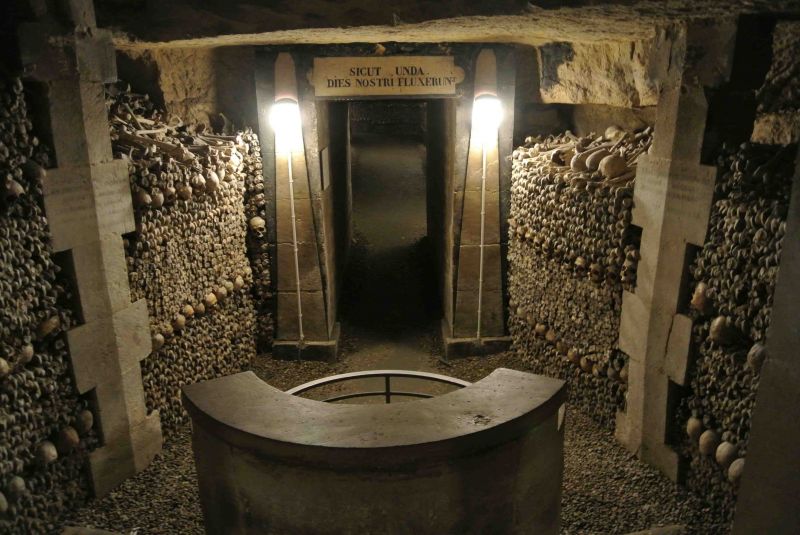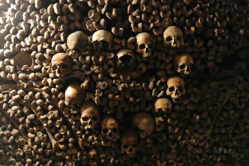 In ongeveer vijftig jaar zijn de skeletten van zo’n zes miljoen mensen zorgvuldig opgestapeld, waarna men er weer lange tijd geen aandacht meer aan heeft besteed. Totdat vandaag de dag de eigenaar, de gemeente Parijs, er per dag zo’n 20.000 euro aan entreegeld uit kan peuren. Niet duidelijk is hoe het met de royalty's voor de tentoongestelden is gesteld. We dalen eerst via een wenteltrap enkele tientallen meters af en komen vervolgens in een ruimte waar op borden wordt uitgelegd hoe het materiaal van de steengroeven hier indertijd verzeild is geraakt. Vervolgens lopen we door lange gangen naar het begin van de verzameling knekels. Het gaat nu ruimte na ruimte verder met opgestapelde botten en schedels waarbij men soms ludieke figuren zoals hartjes heeft gemaakt maar ook steeds heeft vermeldt van welk kerkhof de resten afkomstig zijn en op welke datum het opstapelen heeft plaatsgevonden. Als je zo langs de rijen met beenderen loopt en je realiseert dat er in de oorlog ongeveer evenveel Joden zijn omgebracht dan begint dat aantal wel een stuk meer voor je te leven.