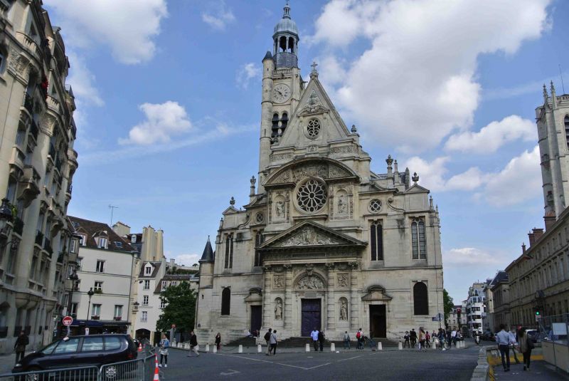 Na afloop volgt weer een lange ondergrondse gang en een wenteltrap naar boven waarna we opeens buiten staan en ons met de kaart moeten oriënteren waar we vandaan zijn gekomen. We besluiten naar het Palais du Luxembourg te lopen en scoren op de weg erheen een patatje dat we lekker in de zon in een park oppeuzelen. Met het huidige mooie weer is de tuin van het Palais du Luxembourg bezaaid met mensen die lekker luieren in de milde voorjaarszon hetgeen een vrolijke aanblik geeft. Van hieruit lopen we naar het Patheon dat echter wegens restauratiewerkzaamheden gesloten is voor het publiek. De schuin erachter gelegen kerk van Saint Etienne du Mont is wel open en herbergt een aantal bijzondere zaken, zoals de tombe van Saint Geneviève (de beschermheilige van Parijs), de glas in lood ramen en de ‘Jube’ (het bijzondere koorhek).
