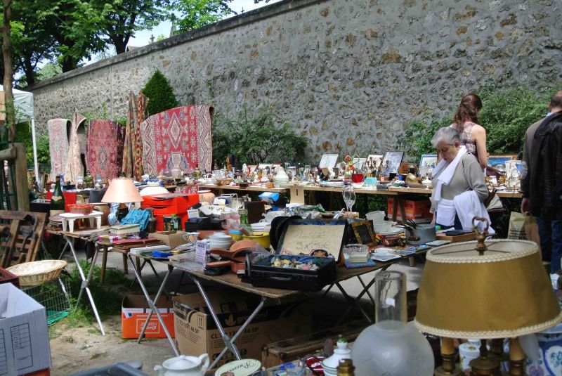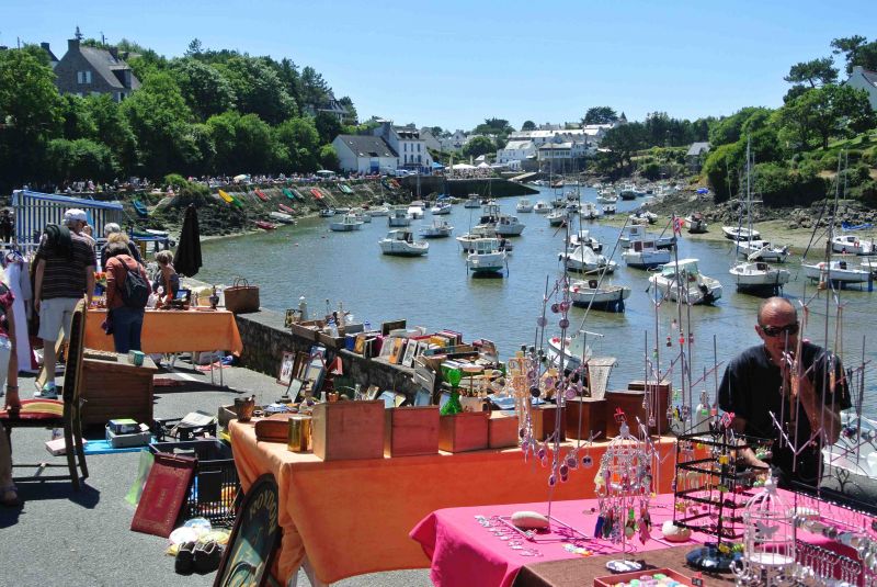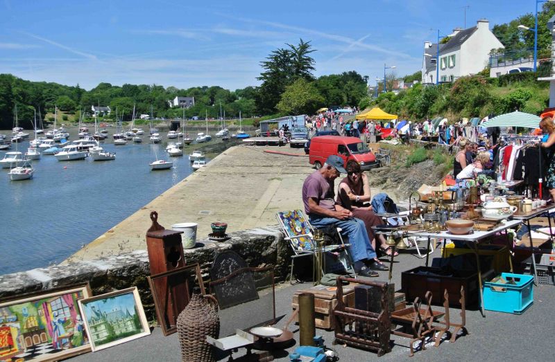 Zondag gaan we een fietstocht maken die we via Wikiloc hebben gedownload. We zijn nog maar net op weg als blijkt dat het eigenlijk een mountainbike tocht is. We worden over net zulke struinpaadjes gestuurd als we gisteren gewandeld hebben. Een leuke en pittige oefening in veldrijden derhalve. We komen ook ditmaal langs Doëlan en nu geven alle Franse vlooien ‘acte de presence’. Een paar honderd kraampjes over een afstand van bijna een kilometer met vooral waar die je in mijn ogen met enige gêne naar het grof vuil zou brengen. Niettemin een bont en gezellig spektakel dat ons gedurende een uurtje weet te bekoren.