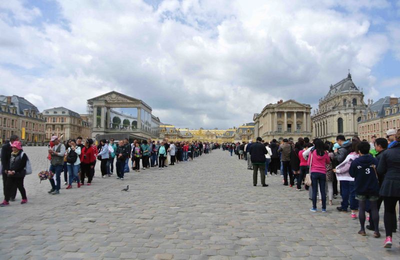 Vandaag staat een bezoek aan het Chateau de Versailles op ons programma. Versailles ligt een stukje buiten het centrum van Parijs. Dit betekent een wat langere reistijd maar ook een andere route omdat we nu van voorstad naar voorstad gaan. Vroeg op derhalve en we slagen er in om kwart voor tien op het station in de rij voor het loket aan te sluiten. Voor ons staat een groep Filippijnen die hun uiterste best doen om zowel het geduld van de loketbediende als mijn geduld uit te testen. Na ongeveer een half uur heb ik onze kaartjes en een aanwijzing hoe te reizen zodat we de trein op kunnen zoeken. We moeten op station La Défense overstappen op de paarse lijn L, maar daar aangekomen zien we alleen aanwijzingen voor lijn T2. Na wat omzwervingen moeten we weer een poortje passeren om bij het perron te geraken. Dat gaat niet door want het poortje weigert ons resoluut de doortocht. Gelukkig is er nog een ticket verkooppunt van vlees en bloed in de buurt en zodra ik de zaak daar uitleg krijgen we gelijk speciale kaartjes uitgereikt waarmee we alsnog verder mogen. Zonder verder oponthoud arriveren we in de buurt van het Chateau en na nog even een bakkie koffie in Café l’Arrivée sluiten we aan in de rij bij de ticket verkoop. Na een uur in de rij zijn we aan de beurt, het is inmiddels kwart over één, en we kiezen ervoor om alleen het Chateau te gaan bekijken. Je kunt ook nog naar het Trianon en naar de tuin, maar omdat we al gezien hebben dat we straks in de volgende rij moeten aansluiten zien we daar maar van af.