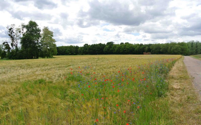 volgende etappe nogmaals komen. In plaats hiervan rijden we richting de rivier, een route die zichzelf wijst omdat het steeds maar omlaag gaat. Net over de brug gaan we linksaf langs het water over een alternatieve route omdat er wegwerkzaamheden zijn. Verderop heeft men een nieuw fietspad aangelegd dat super rijdt. Alleen heeft men vergeten om nieuwe aanwijzingen aan te brengen en op een bepaald moment zouden we volgens ons boekje rechtsaf moeten terwijl er inmiddels geen weg meer is voor fietsers. We besluiten de rivier verder te volgen en komen een paar kilometer verderop bij een camping die wel weer op onze kaart staat. Eerst de meegenomen koffie opdrinken en dan verder. We rijden nu over binnenwegen door afwisselend landschap met volop korenbloemen en klaprozen totdat we in het plaatsje Huisseau-sur-Cosson weer op de oorspronkelijk route uitkomen.