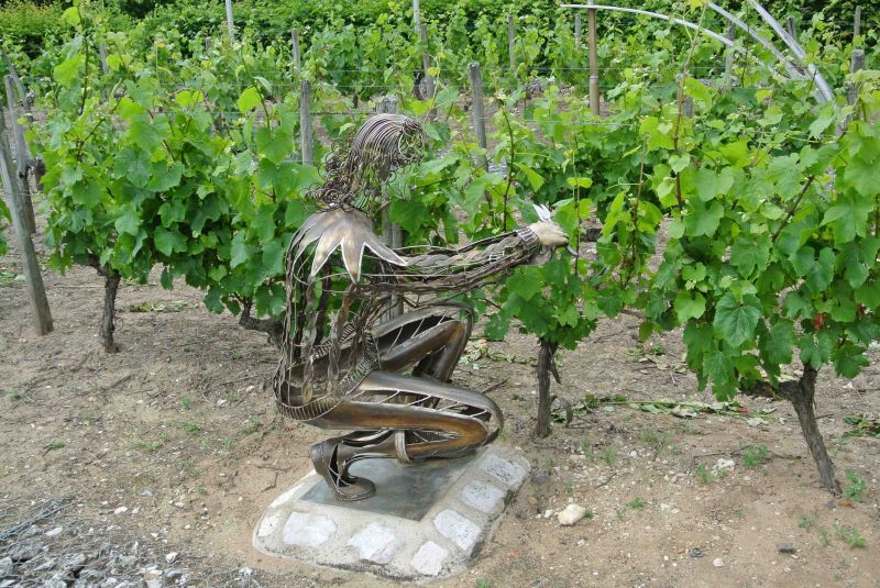 We staan voor de keuze: eerst met de trein naar Blois of fietsen vanaf de camping en terug met de trein. Voor allebei is wel wat te zeggen. Er is vanmorgen niet veel wind maar daarentegen spettert het, terwijl het volgens de weerverwachting na de middag zonnig wordt. We besluiten om eerst te fietsen en verlaten even na half elf ‘ons ‘eiland. Het is inmiddels droog maar bewolkt. De hoeveelheid water die gevallen is bleek net voldoende om je bril mee schoon te kunnen maken. We rijden naar de noordoever van de Loire naar het dorpje Nazelles-Négron. Vandaar gaat de route via de D1 in oostelijke richting. Het blijkt geen drukke weg maar is wel de verbindingsweg tussen de dorpen en biedt daarmee beslist niet de rust van een fietspad. We komen langs verschillende kasteeltjes die soms een beetje vervallen zijn maar toch steeds de moeite waard blijken om op de foto te gaan. In Cangey drinken we op een bankje onze meegenomen koffie, waarna we weer verder gaan richting het plaatsje Onzain dat door mij gemakshalve in ‘Onzin’ is omgedoopt. Daarna gaan we richting de brug bij Chaumont-sur-loire om de rivier te kruisen. Even voor de brug heeft de voorzienigheid een snackwagen langs ons parkoers gedropt waar we graag ons toevlucht zoeken. De patat en hamburger gaan er wel is en intussen blijkt ook de zon er door te komen. Aukje neemt de bij de brug de opgestelde kunstwerken met als onderwerp de wijnoogst op de korrel en direct daarna het kasteel van Chaumont aan de overzijde van de rivier.
