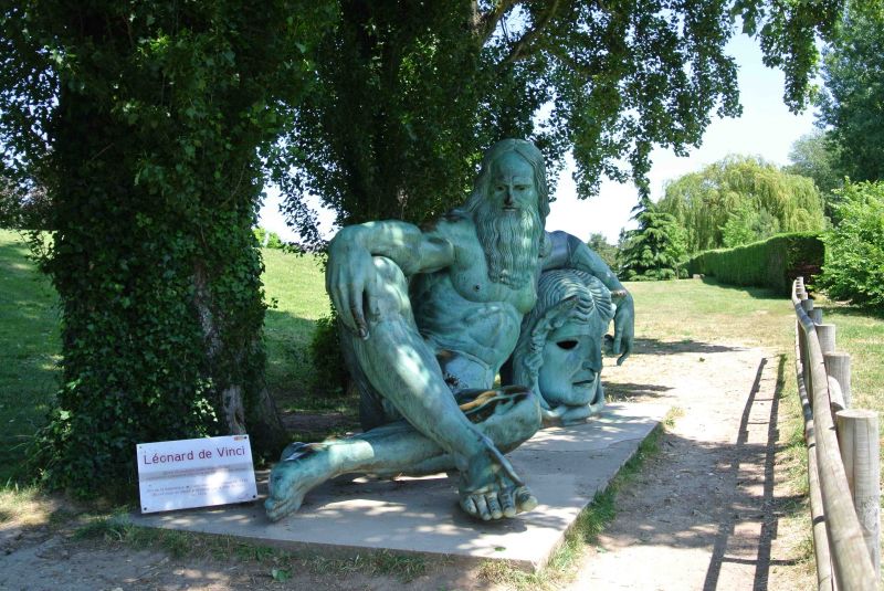 Aanvankelijk had Aukje drie fietsetappes voorbereid waarvan we gisteren de laatste hebben gedaan. Als toegift zouden we vandaag nog een fietstocht naar Tours kunnen maken. Het traject dat voor een belangrijk stuk over wegen met gemotoriseerd verkeer gaat spreekt echter vooral Aukje niet erg aan. Bovendien wordt voor vandaag een temperatuur van bijna dertig graden verwacht. We besluiten daarom vandaag in en rond de camper te blijven en alleen nog een wandeling naar het centrum van Amboise te maken. Naarmate de dag vordert loopt de temperatuur verder op en in de namiddag is deze de dertig graden al een aardig stukje gepasseerd. Voor ons een reden om de wandeling naar de avonduren te verplaatsen. Vanaf het eiland waarop we verblijven is het Château Royal d’Amboise al mooi te zien. Op weg naar het centrum van Amboise komen we langs een beeld dat Leonardo da Vinci voorstelt en indertijd door San Marino aan Frankrijk is geschonken.