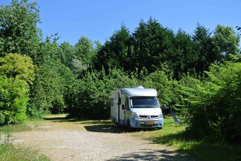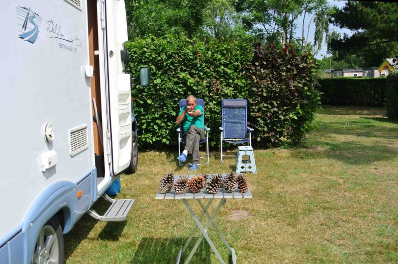 Opvallend is de staat van het gras op de door laurierheggen afgescheiden plekken. Perfect in conditie alsof er een tenniswedstrijd op moet worden gespeeld. Alleen loopt het veld zo schuin dat het voor campers eigenlijk ongeschikt is. We mogen zelf kiezen en gaan voor een plek waar het veld nog het minst afloopt. Maar met de potkrikken onder de camper op maximale hoogte staan we nog zo schuin dat je er steeds aan wordt herinnerd en soms een stapje extra doet. Het sanitair van de camping is simpel maar goed onderhouden. Wij houden het hier wel een paar dagen uit en genieten van de rust en ’s avonds van de vogels, de kikkers en het lekkere weer.
