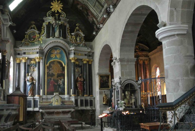 De zon schijnt vandaag weer alsof er gisteren niks is gebeurd en het is het mooiste weer van de wereld. Loncronan is een toeristische trekpleister en dat gaan we vandaag bekijken. Van de campinghouder hebben een tip gekregen om via een mooi binnendoor pad naar het centrum te lopen. We komen het centrum binnen via het kerkhof, voor Aukje altijd een dankbaar object om te bezoeken en gaan daarna de kerk van binnen bekijken. Locronan is genoemd naar de Ierse bisschop Saint Ronan die in heel Bretagne wordt vereerd en in deze streek rond het jaar vijfhonderd heeft gepredikt. Naar het schijnt is hij begraven op de plaats waar nu de naar hem genoemde kerk staat. De kerk stamt uit vijftienhonderd en is, net als de overige huizen uit het dorp, uit graniet opgebouwd.
