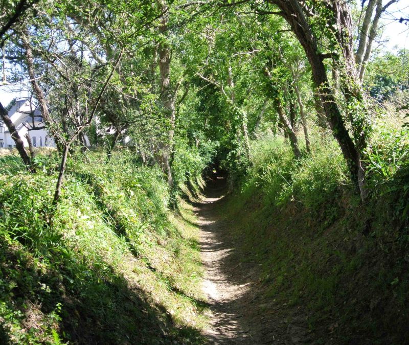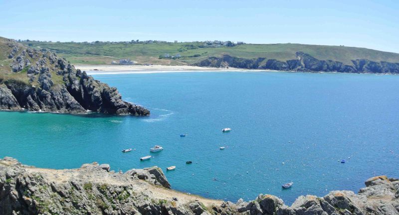 We zijn vooral naar de kust gekomen om een kustwandeling te maken en daar beginnen we dus als eerste mee. Op ons programma staat een rondwandeling vanaf de camping naar het vissersplaatsje Doëlan, op de heenweg langs de kust en terug door het binnenland. Vlak voor de camping is de strandopgang en we lopen dus direct het strand op. Een mooi breed strand dat, zoals bijna overal hier langs de kust, omsloten wordt door een hoge kust en grote rotspartijen. Hoog boven ons loopt het kustpad en we willen aan het eind van het strand daar weer op komen. Dat blijkt een misrekening dus moeten we weer helemaal terug naar de strandopgang en vandaar direct het kustpad op. Een ervaring rijker en een half uurtje later zijn we dus toch onderweg. De kust is niet zo indrukwekkend als bij Quiberon maar het kustpad bekoort ons des te meer. Een prachtig pad dat geen moment verveelt en steeds met de nodige klimmetjes een nieuw uitzicht op de volgende inham biedt. Na ongeveer anderhalf uur langs het pad belanden we in Doëlan waar het nu nog rustig is. Morgen is er de vlooienmarkt maar nu hebben we rustig de gelegenheid om het haventje en de vele scheepjes te bewonderen. De weg terug gaat deels via asfalt wegen maar ik heb via Google getracht om toch nog wat struinpaadjes in te lassen. Dat is aardig gelukt en zo lopen we al zigzaggend door het glooiende landschap over holle weggetjes, totdat…. blijkt dat we kennelijk de weg kwijt zijn. Een half uurtje later dan voorzien komen we toch weer terug bij de camping maar niet nadat we en paar kilometer langs een drukke verkeersweg hebben gelopen.