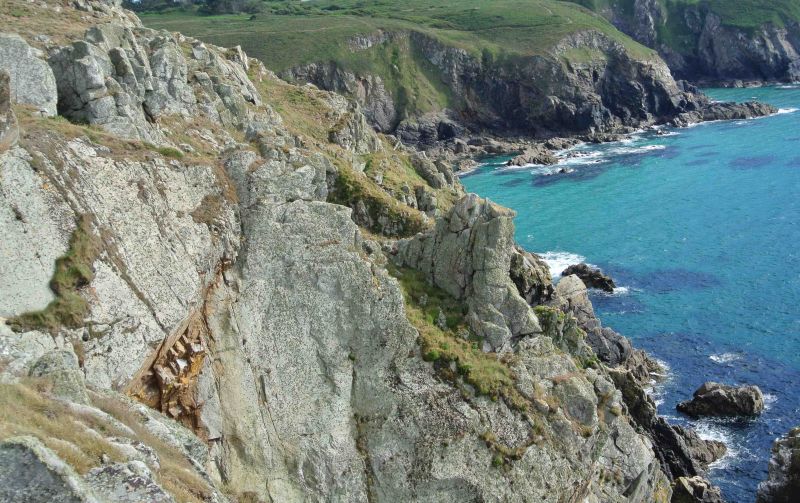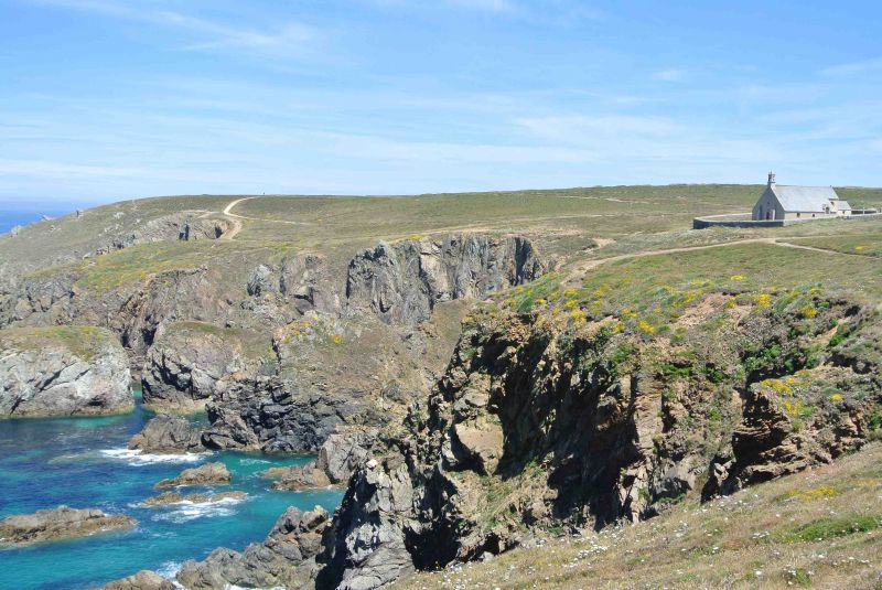 Vanmorgen weer stralend weer met vrijwel geen wind. Ideaal wandelweer dus en we zijn van plan om vandaag een flinke wandeling te maken. We beginnen met Pointe du Van waar we immers valkbij staan. Nadat we uitgebreid de indrukwellende rotsformaties hebben bekeken vervolgen we ons pad en komen vrij onverwacht bij de Chapelle Saint-They die pal aan zee is gebouwd. Het is een typisch kapelletje van deze streek dat geheel uit graniet, het materiaal waar ook de rotsen zijn samengesteld, is gebouwd.