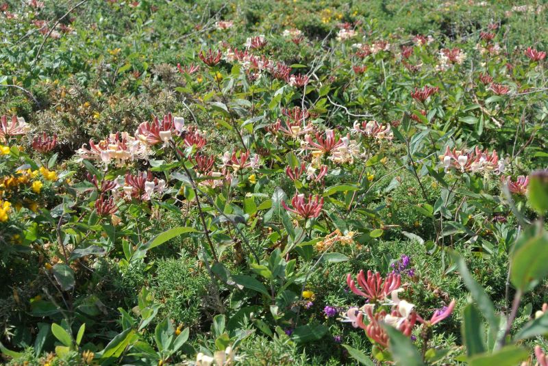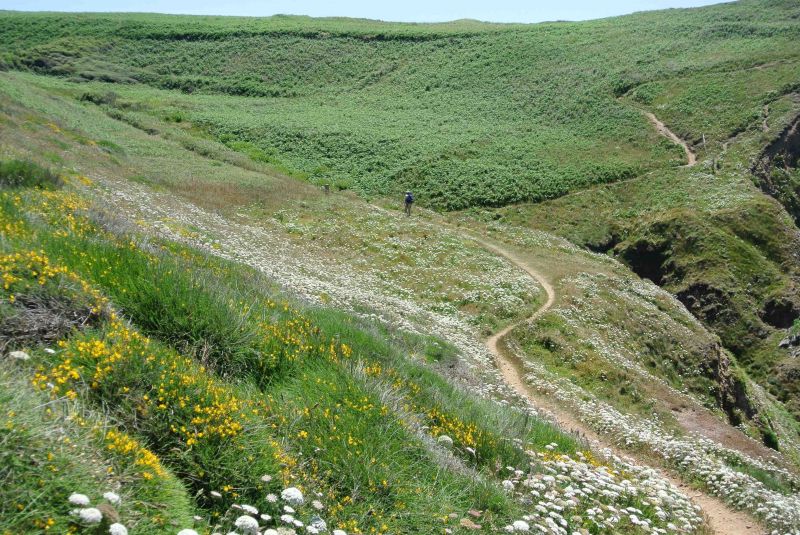 We vervolgen onze wandeling langs een met bloemen omzoomd pad totdat we bij een haventje en daarna bij het brede strand van Baie des Trépassés uitkomen. Dit strand, dat tussen de beide kapen Pointe du Van en pointe du Raz ligt ingeklemd, kent ondanks het mooie weer relatief weinig badgasten. De enige zwemmers zijn de jongelui die een poging doen het surfen onder de knie te krijgen en met hun wetsuits het koude water durven te trotseren. Wij gebruiken het strand voor een lunchpauze en bepreken daarna wat we gaan doen. Langs de gehele Bretonse kust loopt een prachtig wandelpad, de GR34. Het voordeel van een kustwandelpad is dat je het gemakkelijk kan volgen en eigenlijk geen kaart nodig hebt. Een andere eigenschap is dat het enorm slingert en elke punt induikt die de natuur heeft kunnen bedenken. Daarnaast slingert het ook in verticale richting zodat je per saldo niet erg hard opschiet en je jezelf snel verkijkt op de afstand die je kunt afleggen. Het doel was om ook de Pointe du Raz te ronden maar het is inmiddels al tegen drie uur dus besluiten we dat morgen te gaan doen. In plaats daarvan zoeken we een weg door het achterland terug waarbij we een meertje ronden en gebruik maken van verschillende struinpaadjes. Soms is het moeilijk om de voeten droog te houden en dan weer gaan we helemaal schuil tussen de hoge begroeiing. Uiteindelijk komen we tegen half vijf weer bij de camper en ben ik naar later blijkt behalve een leuke ervaring ook een viertal teken rijker.
