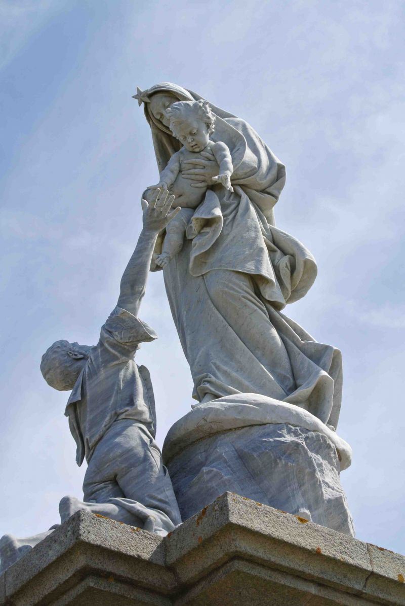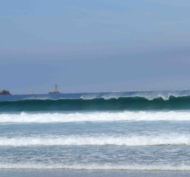 Na twee nachten op de camperplaats verplaatsen we de camper vanmorgen vlakbij het strand waar we gisteren besloten de kustwandeling af te breken. Op deze wijze winnen we tijd en kunnen we alsnog naar Pointe du Raz lopen. Ook vandaag is het prachtig weer en het strand ligt er weer piekfijn bij. De golven zijn vandaag nog een stukje hoger en terwijl we langzaam vanaf het strand omhoog de rotsen oplopen kijken we herhaaldelijk naar de surf die op indrukwekkende wijze op het strand stuk rolt. Na een uurtje lopen door velden met brem, heide, kamperfoelie en wilde orchideeën komen we bij het radarstation dat de in zee uitstekende punt markeert. Men heeft een mooi beeld opgericht voor de schipbreukelingen die in dit gebied tijdens de tweede wereldoorlog hun noodlot tegemoet gingen.