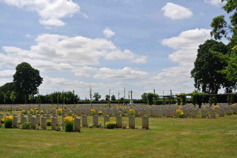 De laatste dagen is het steeds prachtig weer geweest en voor de komende dagen wordt er een hittegolf verwacht. Vanmorgen demonstreren we na het ontbijt de camper aan Clive & Maureen. Na de koffie drinken we in de tuin nog een verfrissing voordat we om half een de thuisreis aanvaarden. Vlakbij Caen stoppen we bij het oorlogskerkhof van Banneville la Campagne waar ruim twee duizend Engelse soldaten in de zomer van 1944 hun laatste rustplaats vonden. Het resterende deel van de in totaal ongeveer vijfhonderd kilometer lange rit verloopt soepeltjes. Alleen bij Lille een kwartiertje file en tegen de tijd dat we bij Antwerpen komen is daar de spits al achter de rug. Om negen uur zijn we weer thuis. Vannacht slapen we nog in de camper zodat we morgen op ons gemak de spulletjes kunnen uitladen en de draad van het ‘gewone’ leven weer kunnen oppakken. Een prachtige vakantie met ruim 2600 kilometer in ruim zes weken zit er weer op.