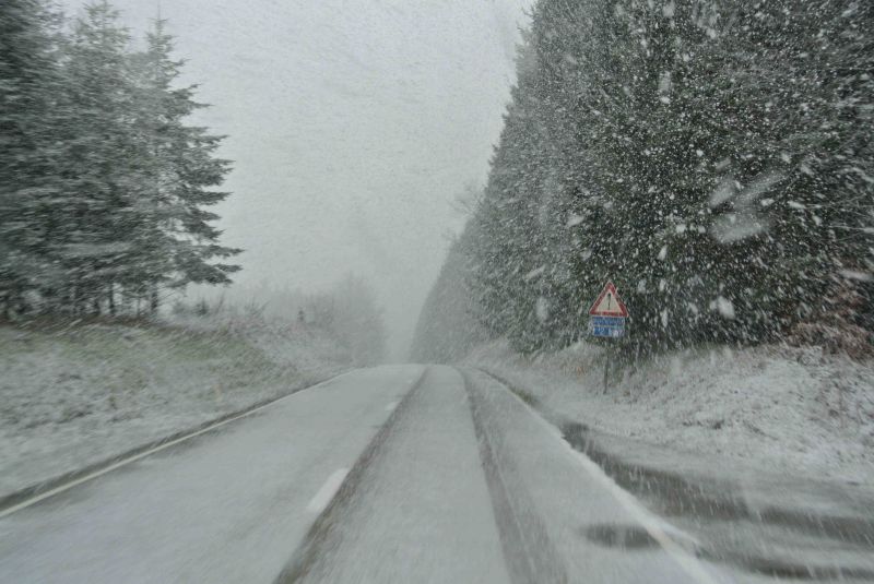 bui na droog geweest en ook nu vertrekken we zonder regen maar wel met een stevige wind. Bij Gouda stuiten we op een kleine file die ons een vertraging van ongeveer tien minuten oplevert. Daarna gaat het vlot naar Rotterdam en vandaar richting Breda. Vanaf de Moerdijk is de stevige wind veranderd in een halve storm met windstoten en tevens begint het te regenen. Bij Hazeldonk houden we onze eerste pauze en werken in een half uurtje ons ontbijt naar binnen. Daarna verder naar Antwerpen en Brussel richting Namen. Over dit stuk hebben we niet te klagen behalve dan dat de regen nu met bakken uit de lucht komt. Dat het nog gekker kan merken we even later, het begint te sneeuwen. Op de borden langs de weg werd al gewaarschuwd voor winterse omstandigheden maar dat betekent in Nederland tegenwoordig regen en wind. Een stuk verderop blijkt dat het menens is want het sneeuwt inmiddels flink.