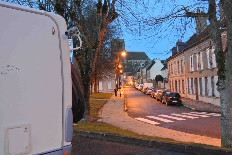 Zodra we de snelweg verlaten om over een niet al te beste binnenweg naar Bouillon te rijden blijkt dat de sneeuw op de weg blijft liggen zodat we de gaten in het asfalt, die hier meer regel dan uitzondering zijn, niet meer kunnen onderscheiden. Gelukkig houdt het op tegen de tijd dat we de Franse grens in zicht krijgen en een kwartier later begint zelfs de zon te schijnen. We leggen de laatste tweehonderd kilometer af al koesterend in het zonnetje waarbij we kiekeboe spelen met de zonneklep. Om twintig over vijven, vlak voor dat het donker wordt, arriveren we in het stadje Sézanne dat ongeveer 80 km ten oosten van Parijs ligt. We zijn de enige camper vandaag op de marktplaats die alleen op zaterdag moet worden vrijhouden. Ten behoeve van de marktkooplui is er een stroomvoorziening gemaakt die camperaars gratis mogen gebruiken. Vanavond snort dus ons elektrisch kacheltje en koesteren we ons in ons huisje op wielen.