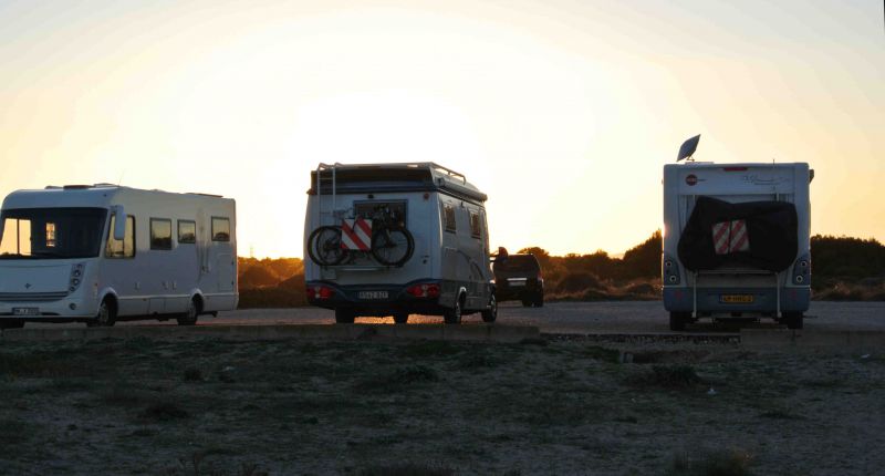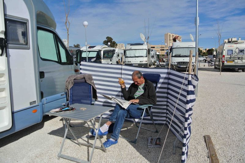 Afgelopen nacht heeft het weer flink gewaaid en ook vandaag staat er een windkracht zeven met nog uitschieters naar boven. Het is niet koud en het zonnetje schijnt. Met een dun windjack aan kun het buiten goed uithouden. Na het ontbijt ga ik de omgeving verkennen. Aukje blijft binnen want ze heeft afgelopen nacht vanwege het hoesten slecht geslapen. Ons camperpark, dat bijna vol staat en ongeveer 40 campers kan herbergen, is aan de rand van een industrieterrein dat verder een beetje in de ‘middle of nowhere’ ligt. Op het terrein, dat nog maar half volgebouwd is, is een grote Lidl en een Mercadonna supermarkt met een heleboel parkeergelegenheid zodat mensen uit de wijde omtrek hier heen komen om boodschappen te doen. Verder is er nog een Centre Commercial, een soort winkelcentrum waar in twee verdiepingen ongeveer veertig winkeltjes een plek kunnen vinden. Alleen, het nog maar enkele jaren oude centrum staat nog goeddeels leeg. Behalve Hollands Welvaren, een supermarktje voor Nederlandse waren, en Petra’s lunchroom (een door Nederlanders gedreven cafetaria), is er niet veel te beleven. Zaterdags is er op het industrieterrein ook nog een weekmarkt. Vandaag waait het zo hard dat de spulletjes uit de kraampjes waaien. Juist toen ik langskwam zag ik door een windvlaag een hele voorraad dropjes op de grond belanden. Ik heb maar niet afgewacht wat de verkoper er nadien mee gedaan heeft. Nadat ik mijn rondje heb afgemaakt kruip ik weer de camper in en hou ik verder Aukje gezelschap. Links en rechts van ons staat en camper waarvan de eigenaren al langere tijd weg zijn. Ze gebruiken het camperpark als een bewaakte parkeerplaats. Vanmiddag kwam een van beide, Nederlanders, juist terug. Zij hadden het laatste half jaar een huisje gehuurd en gaan nu weer met hun camper op pad.