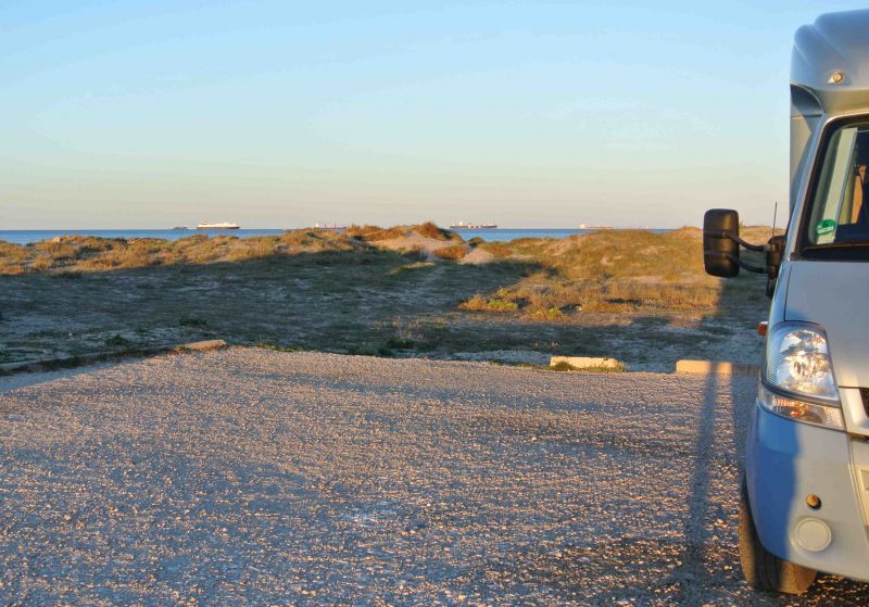 Even na negen uur rijden we de camping af. Gelukkig heeft onze TomTom ontdekt dat er ook nog een asfaltweg vanaf de camping is zodat er niet nog een lading modder tegen de camper bij komt. We rijden richting Barcelona en ook nu valt het op hoe goed de vierbaans autoweg is. We vorderen vlot en met tussenstops voor het ontbijt, de koffie en het middageten bereiken we om half zes de gratis camperplaats pal aan zee bij Sidi Saler op ongeveer tien kilometer onder Valencia. De hele dag hebben we zonnig weer gehad en de buitentemperatuur liep op tot ongeveer zeventien graden, echter met nu en dan flinke zijwind die uit tochtgaten vanachter de bergen lijkt te komen. Het stuk tot Barcelona reden we door een mooi berggebied en daarna werd het landschap getooid met steeds meer palmbomen en sinaasappelplantages. De sinaasappelpluk was hier en daar nog in gang. Op een grote parkeerplaats die in de zomer door badgasten wordt gebruikt staan al twee andere campers, een grote en een kleine. Nadat we onze camper ernaast hebben geparkeerd maken we rond zeven uur in donker een strandwandeling om even uit te waaien. Er staat een fris windje maar in de luwte van de camper is het goed uit te houden zodat we ’s avond bij een biertje naar de sterren kijken.