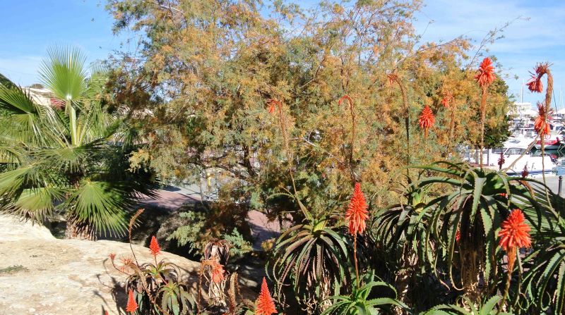 We besluiten eigenmachtig een stukje van de tuinen te onderzoeken en Aukje maakt van de gelegenheid gebruik om wat leuke foto’s te maken. Om vier uur zijn we terug bij de camper en een half uurtje later rijden we de camperplaats van San Fulgencio op. We krijgen gelijk een plaatsje toegewezen waarna Aukje aan het klaarmaken van het eten begint terwijl ik de boel aansluit en de administratie met de beheerster afhandel. Het waait nog steeds flink maar we hebben een plekje in de luwte van een hele grote camper uitgezocht.