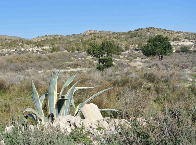 Vandaag staat de eerste echte wandeling in de Spaanse natuur gepland. Het is nog een bescheiden afstand van ruim 6 kilometer maar goed genoeg om mee te beginnen. Vanmorgen weer stralend weer en als het huiswerk gedaan is zijn we klaar om te vertrekken. We willen tevens langs de Lidl rijden want we staan hier al weer een week en de gewichtige zaken raken een beetje op. Even na twaalven rijden we het camperpark af en tuffen naar de Lidl die ongeveer vier kilometer verderop is. Vandaar is het nog een kilometer of zeven naar het beginpunt van de wandeling. We hebben een folder met een beschrijving van de route en bovendien zou deze zijn gemarkeerd. Om half drie gaan we van start. Na een paar honderd meter komen we langs een pad dat met hekken en borden is afgesloten. Ik denk dat het een privé terrein betreft dus loop verder in de hoop aanwijzigen te vinden .