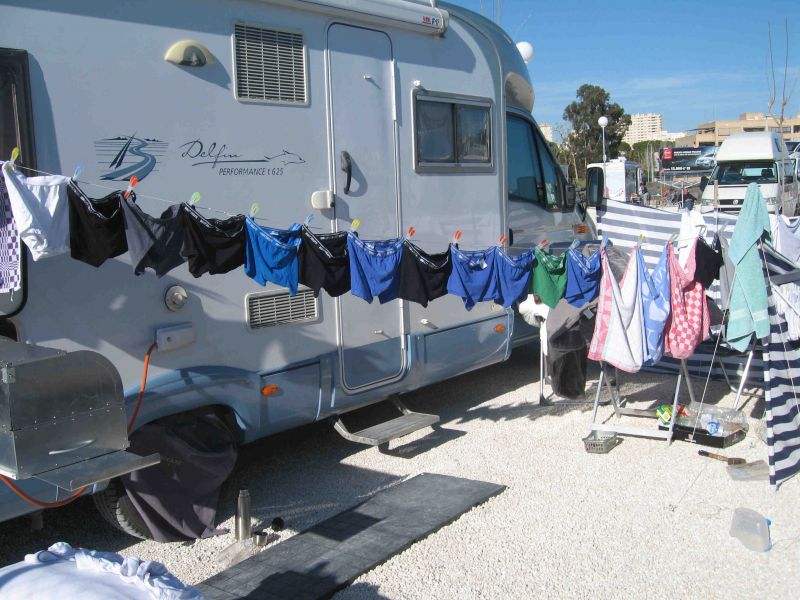 Daarnaast ´knijpt´ de beheerder de machine vaak om tijd en energie te besparen. Dan blijkt dat als je b.v. op 60 graden wilt wassen dat de machine de muntjes te snel opgegeten heeft en er dan mee stopt. Aukje weet met een paar trucjes ‘lees extra munten’ de machine toch haar wil op te leggen. Enfin, het is in ieder geval prettiger dan met de hand alles wassen dus waar klagen we over. Omdat er op deze camperplaats bijna vijftig campers staan en er maar één machine is, staat Aukje al vroeg paraat. Het lukt haar om de wasmachine op tijd te ´claimen´ en door steeds de wekker te zetten zorgt ze er voor dat de drie ladingen aansluitend aan de beurt komen. De wasdroger ziet alleen kan de zachte was goed droog te maken. Dus span ik een draadje op de camping om er een echt Hollands tafereel van te maken. Aan het einde van de dag zijn we twintig euro verder en hangt er nog steeds was aan te lijn om te drogen.