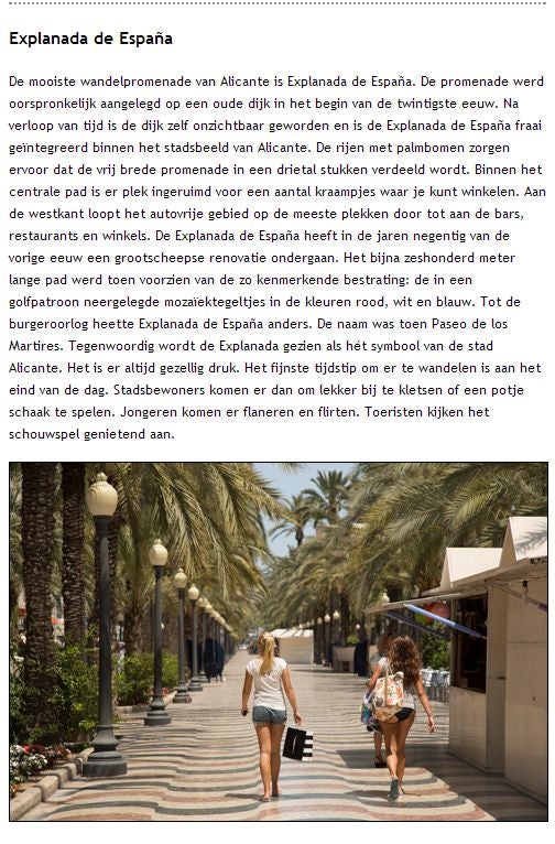 nabij de haven. Als we uitstappen bij station Luceros komen we midden in de stad terecht. Op ons kaartje kunnen we niet goed zien waar we precies zijn want alleen de hoofdstraten worden vermeld. Na even zoeken en een paar keer vragen komen we toch bij het VVV. Daar heeft men niet veel meer info dan een wat uitgebreidere stadsplattegrond waarop men de oude wijk van Alicante en de heuvel van Castillo Santa Barbara weet aan te duiden. Overigens blijkt dat de tramlijn al enkele jaren geleden is omgelegd en dat het oude stuk niet meer in gebruik is. Maar ja, zoals de ANWB nog oude boekjes op voorraad heeft zullen er nog wel meer mensen op het verkeerde been worden gezet. We lopen door de smalle oude straatjes van oud Alicante waar we wel enkele foto’s van hadden willen laten zien…. we zijn ons fototoestel vergeten. We proberen nog een paar geschikte ansichtkaarten te vinden, echter tevergeefs. De kaarten zien er niet uit. Op ons lijstje staat de Kathedraal van Sankt Nicolas. Met weer vragen komen we echter voor een gesloten deur te staan. Dan maar naar het kasteel. Zoals te verwachten is dit een aardige klim. Het is ruim twintig graden en het zonnetje schijnt lekker dus lassen we een paar korte pauzes is op de weg naar boven. Het kasteel stamt uit de elfde eeuw en is in de middeleeuwen enkele maken uitgebreid. Alicante is een oude stad die teruggaat tot de Romeinse tijd. Het kasteel was bedoeld om de stad onder meer te beschermen tegen zeerovers. We bekijken alle onderdelen van het kasteel dat vrij toegankelijk is. In het restaurant ter plaatse drinken we een kopje koffie waarna we het resterende deel van het kasteel inspecteren. Vanaf het kasteel heb je een prachtig uitzicht over Alicante en de wijde omgeving. Na afloop lopen we omlaag en naar de haven. Langs de haven is een mooie brede wandelpromenade aangelegd waarlangs terrasjes zijn gevestigd. Het valt op hoeveel er zich in de buitenlucht afspeelt waaruit blijkt dat men een groot deel van het jaar buiten kan vertoeven. Rond half zes gaan we richting het tramstation en om half zeven stappen we de camper weer binnen.