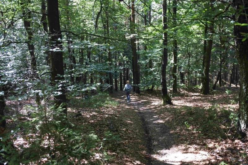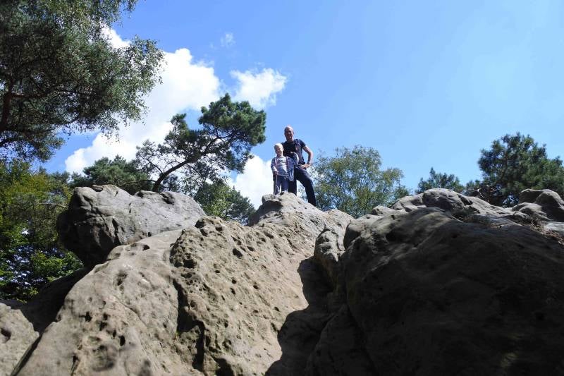 Na eerst wat aanwijzingen en waarschuwingen klimt Jelle als een volleerd rotsbeklimmer naar boven. Terwijl oma soms op haar achterwerk naar beneden glijdt heeft Jelle totaal geen ontzag voor de hindernissen en beklimt de ene na de andere rotspartij. Aansluitend maken we een rondwandeling, eerst door het bos, daarna steil omhoog een heuvel op en daarna langs een mooi slingerend pad tussen de varens door.