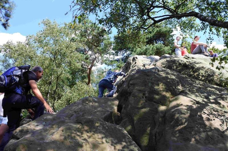 Na één nachtje op deze camping gaan we alweer verder. Op maar tien kilometers vanaf de camping zijn de Dörenther klippen en die willen we, drie jaar na ons vorige bezoek, graag nogmaals beklimmen. Jelle is inmiddels 8 jaar en dat maakt dat hij deze uitdaging wel aan durft. Vanwege de drukte op deze zomerse vakantiezondag is het lastig om een parkeerplek te vinden. Maar eenmaal op pad blijkt de drukte mee te vallen en een kwartiertje na ons vertrek vanaf de camper krijgen we de eerste berg stenen in zicht.