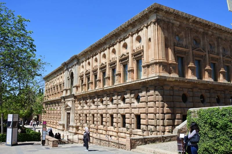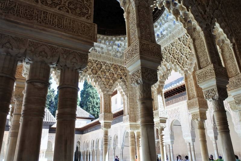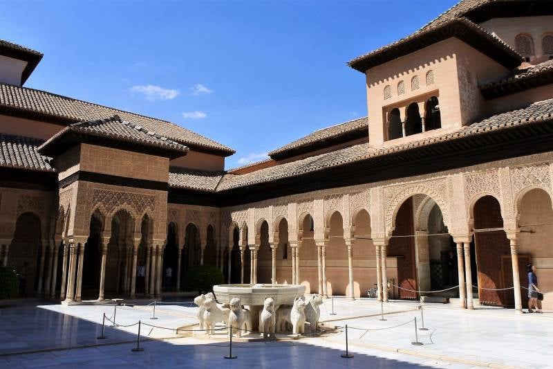 Vandaag gaan we nogmaals met de bus naar Granada, ditmaal voor een bezoek aan het Alhambra. Het Alhambra (Arabisch voor: Rood paleis) is het complex van waaruit in de middeleeuwen het koninkrijk Granada werd geregeerd. Het omvat globaal een viertal componenten: De vroegere Medina, het Alcazaba, de Generalife en het Paleis van de Nazriden. Vooral dit laatste onderdeel is zeer de moeite van het bekijken waard, maar niet erg groot. Daarom wordt voor een bezoek een tijdslot aangegeven waarbinnen je dit gedeelte mag bezoeken. De belangstelling voor het Alhambra is tegenwoordig enorm te noemen. Daarom hebben wij eergisteren via de camping kaartjes gereserveerd en kunnen we vanaf twee uur terecht. Alle niet gereserveerde kaarten voor vandaag zijn uitverkocht, hetgeen inhoudt dat er geen wachtrij meer is en wij direct aan de beurt zijn. Eenmaal binnen wordt een volgorde van bezoek aangegeven zodat de stroom mensen een beetje gereguleerd wordt. Veertien jaar terug, toen ik hier voor het eerst was, was dit wel anders. Je kon kriskras overal rondlopen en er waren slechts een handjevol mensen om je heen. Als eerste komen we bij de vroegere Medina, het gedeelte waar vroeger de woningen voor het personeel waren gebouwd. Hiervan zijn tegenwoordig alleen nog wat fundamenten over. Het overgrote deel van het gebied is later bebouwd met een kerk en een klooster. De rest is omgetoverd in een tuin. Verder lopend komen we bij het grootste gebouw van het complex: het paleis van ‘onze’ koning Karel V (voor de Spanjaarden Karel I). Nadat Ferdinand en Isabella de laatste Nazrid-heerser Boabdil hadden verdreven, werd Granada met het mooie Nasrid paleis als een belangrijke buit gezien Hun kleinzoon Karel gaf in 1526 opdracht om ernaast een nieuw groot vierkant paleis te bouwen. Middenin bevindt zich een grote ronde binnenplaats, vanwaar je twee ringen ziet waarachter de verschillende verblijfsruimten schuil gaan. Wel groot, maar niet erg verfijnd allemaal.