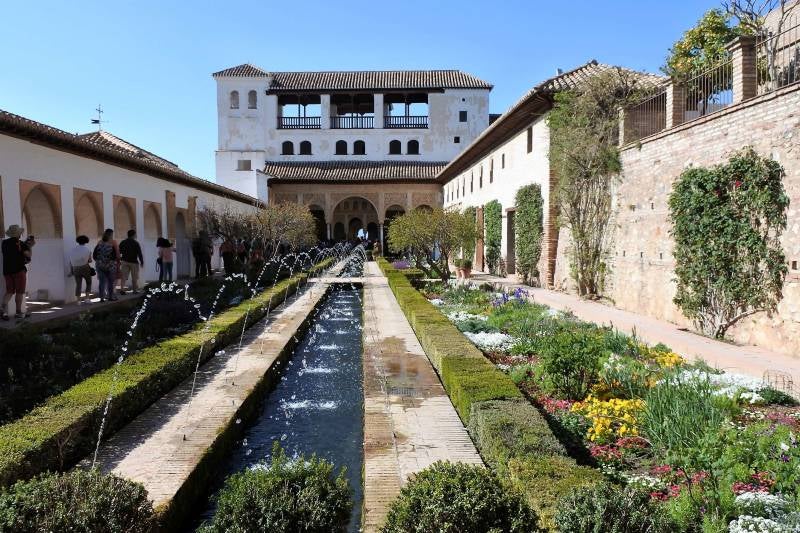 Hoewel binnen het Alhambra complex, is het Alcazaba voorzien van extra muren en toegangspoorten. Met robuuste torens op de verschillende hoekpunten, doet het geheel toch niet veel anders aan dan wat we bij een verschillende andere forten hebben gezien. Als laatste gaan we de Generalife bezoeken. Dit was het recreatieoord van de sultan en omvat een paar fraai aangelegde tuinen en een paleis waar vooral ook gasten werden ondergebracht. Opvallend is hoe de planten momenteel in bloei staan, wat een totaal andere indruk oplevert dan toen ik hier eertijds in het najaar was. Onderweg haken we even aan bij de gids van een Belgische schoolklas zodat we nog wat extra informatie opdoen. Nadat ook de Generalife uitgebreid is bekeken haasten we ons richting het centrum waar we nog juist op tijd arriveren voor de bus naar de camping.