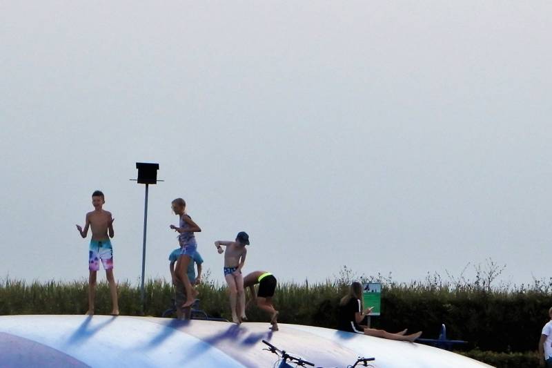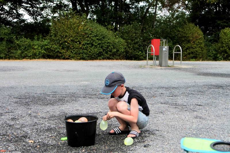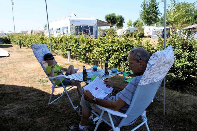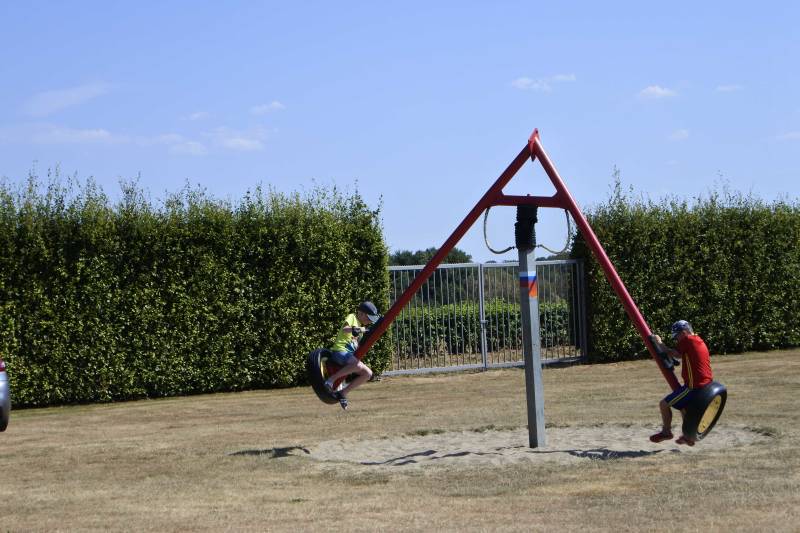 Wij krijgen een plekje aan de rand van het sportveld en dat blijkt geen verkeerde stek met toch nog wat privacy en vooral ook een windje erbij. Nadat alles op z’n plek staat gaat Jelle met opa naar het zwembad en terwijl hij zich in het water uitleeft leest opa zijn krantje op de aanliggende speelweide.