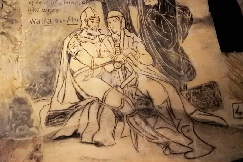 Ondanks het warme weer gaan we vandaag toch op pad. Dat kan ook wel want op het programma staat een bezoek aan de mergelgrot en daar is het zomer en winter 12 graden Celsius. Eerst even doorbijten in een warme bus gevolgd door een korte wandeling door het snikhete centrum van Valkenburg, maar even daarna kopen we toegangskaartjes bij de Fluweelen grot voor een rondleiding. Na een paar minuten meldt de gids zich en neemt ons mee naar de koelte onder de grond. Met een sappig Limburgs accent vertelt hij met wat humor erbij hoe de grotten zijn ontstaan en vooral ook wat de mensen er in de afgelopen paar eeuwen hebben uitgespookt. Een rondleiding van meer dan uur vliegt voorbij en brengt ons uiteindelijk via een van de oorspronkelijk zes vluchtgangen bij de ruïne van het voormalige Kasteel van Valkenburg, dat op last van stadhouder Willen III in 1672 is verwoest. De ruïne bekijken doen we bovengronds, dus in de hitte van de brandende zon.
