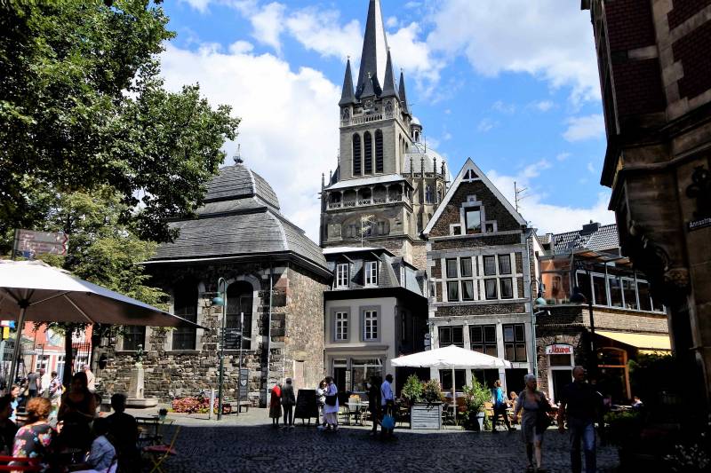 Na een rustige nacht maken we ons in de ochtend gereed voor vertrek. Dat gaat plotseling niet zo rustig, want vlak vóórdat we wegrijden breekt nog even een kort maar hevig onweer los. Gelukkig valt er niet zoveel water dat wegrijden op deze boerencamping niet lukt en tegen de tijd dat Kerkrade in zicht komt schijnt het zonnetje alweer. Het doel is de Columbus Earth Center waar een film over de aarde, gezien vanuit de ruimte, wordt vertoond. De voorstelling bestaat uit drie delen, waarbij we tijdens het tweede deel in een diepe ronde ruimte kijken waarin beelden van de aarde zoals gezien vanuit een ruimtestation worden geprojecteerd. Opvallend is hoe scherp en gedetailleerd de beelden van grote afstand kunnen worden gemaakt. Toch is het totaal minder spectaculair dan de reclame vooraf beloofde en valt het geheel dus een beetje tegen. Na afloop is het maar een ritje van enkele kilometers naar de camperplaats van Aken. Aken heeft nabij het centrum voor zover wij weten geen campings en de camperplaats is de enige in de omtrek. Vandaar ook dat in de loop van de middag zich steeds meer liefhebbers zich aandienen en het maar goed is dat wij op tijd waren en een dus prima plekje konden bemachtigen, want ’s avonds kan er geen camper meer bij.