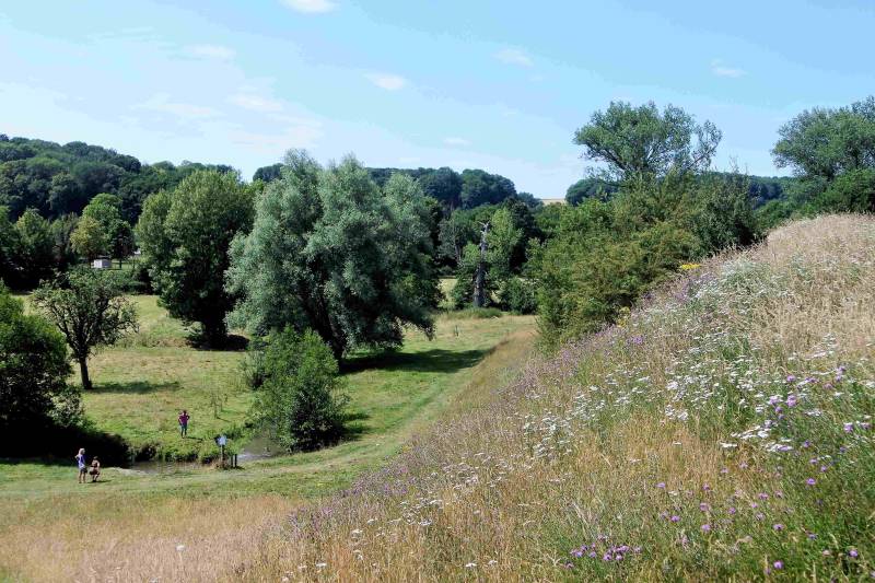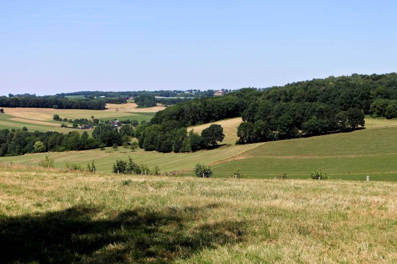 Zuid-limburg wordt doorsneden door de riviertjes de Geul en de Gulp. Beiden vinden hun oorsprong in België. De minst waterrijke van de twee, de Gulp, stroomt door Slenaken en komt bij Gulpen in de Geul uit, waarna ze gezamenlijk de Maas opzoeken. Wij bivakkeren op een plateau aan de rand van het Gulpdal en hebben vanaf hier een mooi uitzicht over de omgeving. Alle reden om een rondwandeling rondom onze camping en door het dal van de Gulp te maken. Het is ook vandaag prachtig weer en de temperatuur zou wat ons betreft - er is altijd iets om over te klagen - zelfs een tandje minder mogen. Gelukkig biedt het gebied volop afwisseling tussen vlakten en bos zodat we zeker de helft van de tijd tegen de zon zijn beschermd. De wandeling kan in twee delen van elk ongeveer zeven kilometers worden opgedeeld zodat deze ook met kleinere kinderen goed te doen is. Het eerste deel gaat vooral over het plateau en daarna duiken we het Gulpdal in en komen tenslotte via Slenaken weer terug bij de camping. Al met al een mooie tocht waar we ruim vier uur over hebben gedaan.
