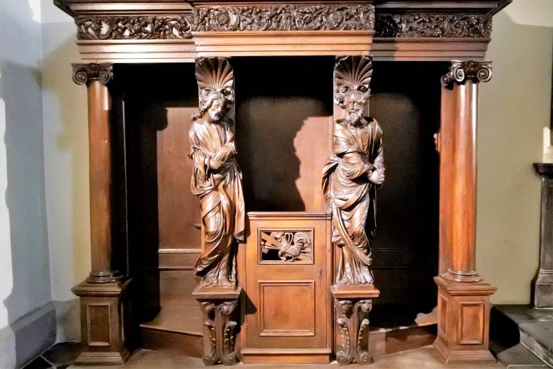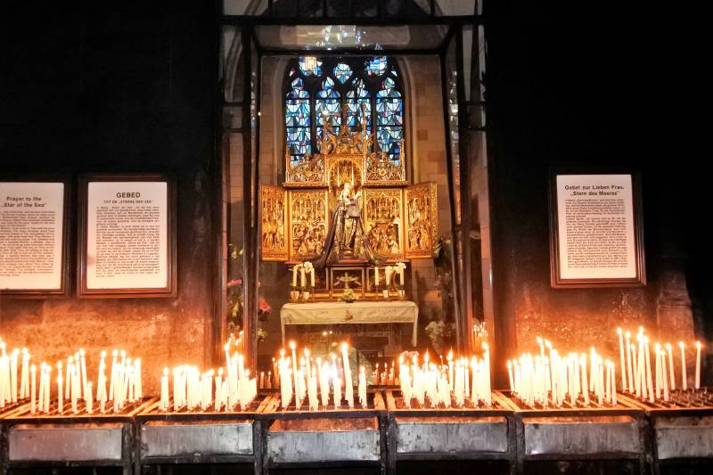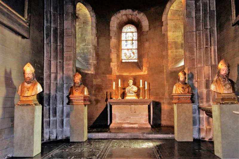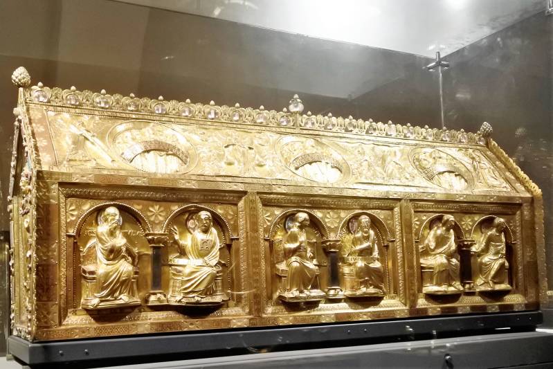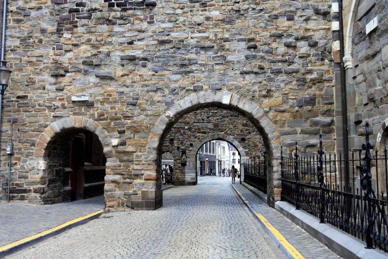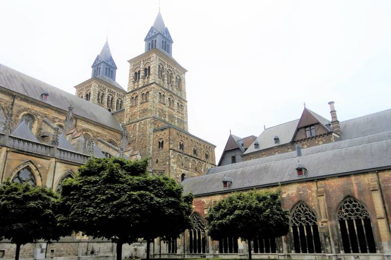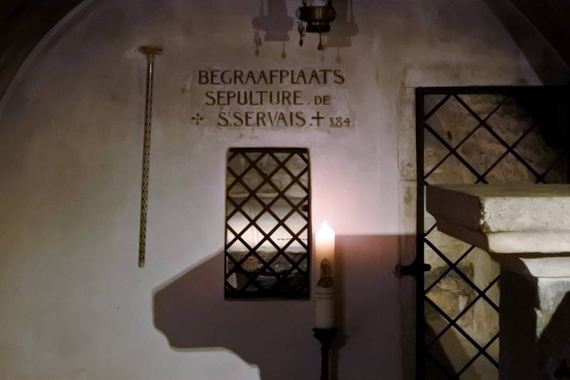 Links de doorgang bij de oude westbouw. Midden de Sint Servaas basiliek, de oudste kerk van ons land. Rechts: De noodkist met relieken van Sint Servaas, waarmee men in tijden van nood door de stad trok om gevaar af te wenden