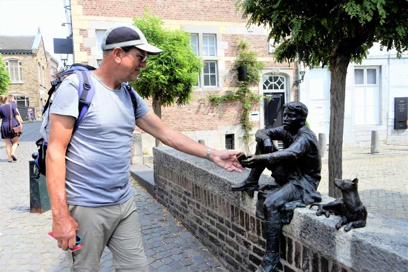 Nu we hier toch zijn willen we onze wandeldagen afwisselen met een stadsbezoek aan Maastricht, dat op ongeveer 25 kilometers vanaf de camping ligt. Bus 57 brengt ons rechtstreeks erheen dus posteren we ons om tien uur bij de halte nabij de camping. Zo’n tien minuten na de aangegeven vertrektijd is er nog geen spoor van de bus en ongerustheid slaat toe: zijn ze toch weer aan het staken, is hij al weg of hebben we te maken met een Limburgs kwartiertje vertraging? Als hij weer wat later toch komt, houden we het maar op een extra afgedwongen plaspauze en slingeren daarna door het Limburgse heuvelland naar onze bestemming. Ons eerste doel is het VVV waar we een plattegrond aanschaffen. Vandaar starten we met de rond wandeling in de GPS die van internet is geplukt. De route voert door het oudste deel van de stad met de Onze Lieve Vrouwe basiliek en daarna langs de oude vestingwerken aan de zuidkant van de stad, waar ook het riviertje de Jeker stroomt.