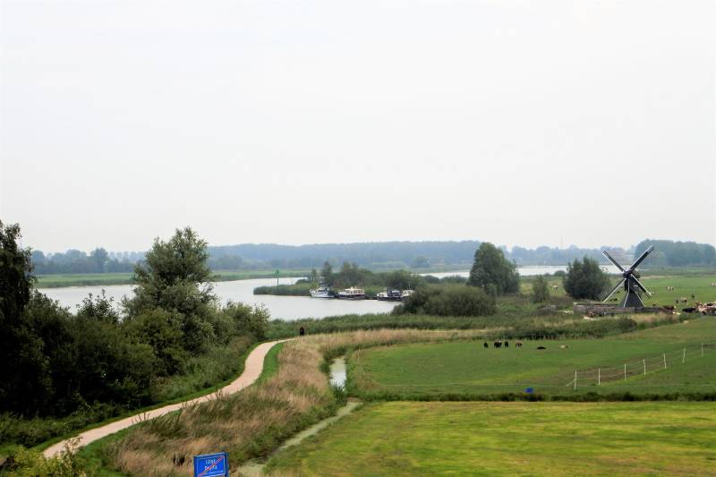 Voor ons geen vakantie zonder ook een wandeling. Op ongeveer vier kilometers van Sneek ligt het ‘stadje’ IJlst en dus kunnen we daar al wandelend gelijk ook een kijkje gaan nemen. Vanaf internet heb ik een rondwandeling gedownload en deze zodanig aangepast dat het vertrek en aankomstpunt bij onze camping ligt. Voor vandaag wordt in de namiddag regen verwacht, dus is het zaak om zo vroeg mogelijk op pad te gaan. En daar wringt bij ons gewoontegetrouw de schoen, zodat het toch al weer half elf is als we de camping achter ons laten. Het eerste stuk gaat langs de gracht die de rand van het oude centrum vormt en daarna ontvouwt het open Friese landschap zich voor ons. Met in de verte hier en daar een kerktoren en daartussen grasland met de bekende Friese koeien komt het overeen met de voorstelling die ik me vooraf van had gemaakt. Wel mooi, maar op den duur toch ook een beetje eentonig, zodat we het niet erg vinden dat Nijezijl vlakbij IJlst in zicht komt. Een kwartiertje later sluiten komt de ophaalbrug over het riviertje de Geeuw in zicht die natuurlijk juist is geopend om de vele bootjes door te laten. Net over de brug houden we bij een snackbar onze lunchpauze. Inmiddels begint het ook al een beetje te spetteren. Het stadje IJlst was bekend als handelsstad en om zijn scheepsbouw. Jarenlang ook bekend vanwege de firma Nooitgedacht, fabrikant van gereedschappen, houten speelgoed en schaatsen. Inmiddels bestaat het bedrijf niet meer en rest alleen de hoge fabrieksschoorsteen die het centrum domineert. Zodra we IJlst bijna uit zijn ontwaren we plots de fontein uit het 11 Fountains project. Ditmaal in de vorm van een bos bloemen die in een grote vaas is geplaatst.