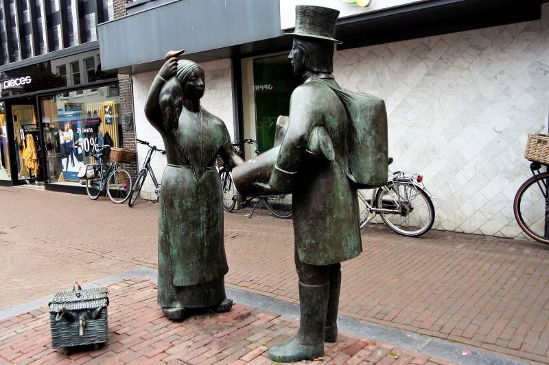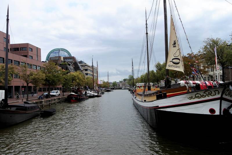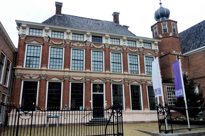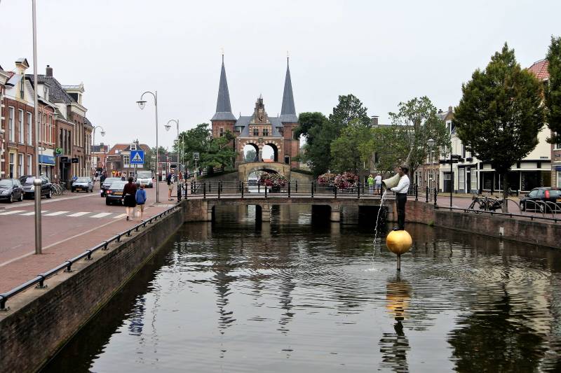Afgelopen nacht heeft het flink geregend maar tegen de tijd dat we bij onze positieven komen is het dreigend maar droog. Dat komt goed uit, want vandaag staat een bezoek aan de Friese hoofdstad op ons programma. De reis erheen gaat met de bus en om het extra aantrekkelijk te maken heeft de camping ons gisteren een paar OV-chip kaarten cadeau gedaan waarmee een dag door Friesland kan worden gereisd. Het mooie stationsgebouw uit 1863 vormt het vertrekpunt voor een rondwandeling door het centrum. Op het stationsplein staat een recent geplaatste publiekstrekker, de fontein van Jaume Plensma die uit twee vijf meter hoge kinderhoofden bestaan waarlangs een mist uit de grond omhoog stijgt. De Spaanse kunstenaar kreeg naar verluidt het idee voor een mistfontein toen hij bij een bezoek aan Friesland de ochtendnevel gewaar werd. Vanaf het station gaat de route over de gracht het al gezellig drukke centrum in, waar we al snel uitkomen en op een gezellig druk Wilhemina plein met het Fries Museum. Een goede gelegenheid om alvast een kaartje te kopen, want na de rondwandeling willen we het museum bezoeken. Dat blijkt geen sinecure, want vrijwel alle kaartjes zijn uitverkocht zodat we ons tevreden moeten stellen met slechts één uurtje museumbezoek vlak voor sluitingstijd. Voldoende tijd dus om eerst onze rondwandeling af te maken. Hierbij stuiten we vervolgens op een grote groep in witte overals geklede jongelui. Het blijken eerstejaarsstudenten tijdens hun introductieweek en daarbij de stad ‘opluisteren’ met allerlei activiteiten. Wij vervolgen onze route en komen daarbij langs een hele trits, goed onderhouden, gebouwen zoals: de Waag, de scheve Oldenhove, het Princessehof, het Stadhouderlijk Hof, het Stadhuis en de Kanselarij.