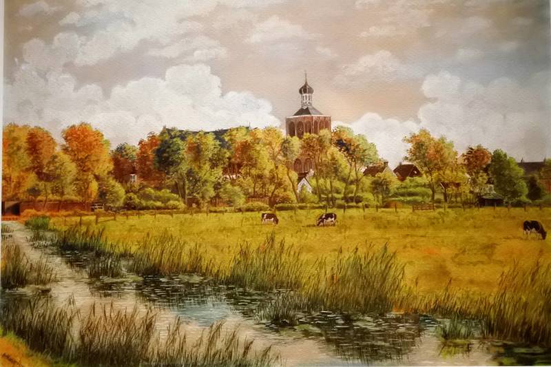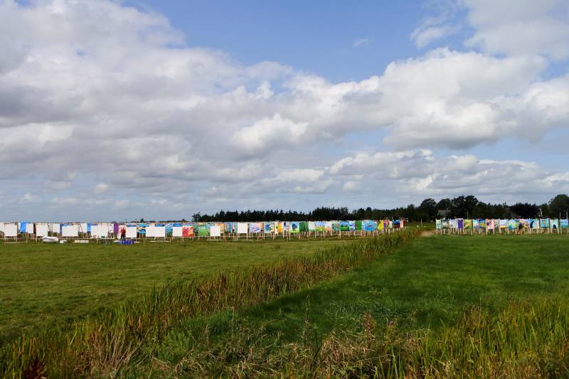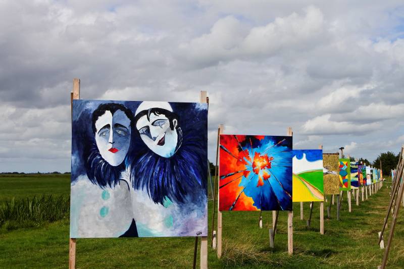 Vandaag alweer de laatste dag van onze mini vakantie. Inmiddels hebben we vier ‘steden’ bezocht en met een kleine omweg is het mogelijk om, op weg naar huis, nog een vijfde stad aan te doen. Sloten is met 740 inwoners het kleinst van de Friese steden, maar doordat de kern goed bewaard is gebleven zeker het bezoeken waard. De stadskern is autovrij gemaakt maar aan de rand is voor voldoende parkeerruimte gezorgd. Ons oog valt direct op een grote verzameling borden die in het weiland staan opgesteld. Ze zijn van het Colourfield Performance project van Sneker kunstenaar Dirk Hakze, dat in het kader van het Culture Hoofdstad 2018 is opgezet. Honderden kunstenaars maken ter plekke hun kunstuiting op een groot vierkant paneel. We nemen uitgebreid de tijd en lopen tussen de rijen door om te kijken of er ook nog iets tussen hangt dat ons aanspreekt. De kunstwerken zijn op acrylverf basis en de meesten blijken ook te koop. Zonder aankoop verlaten we tentoonstelling en lopen via een onderdoorgang het stadje binnen.