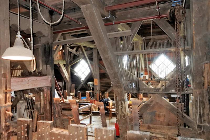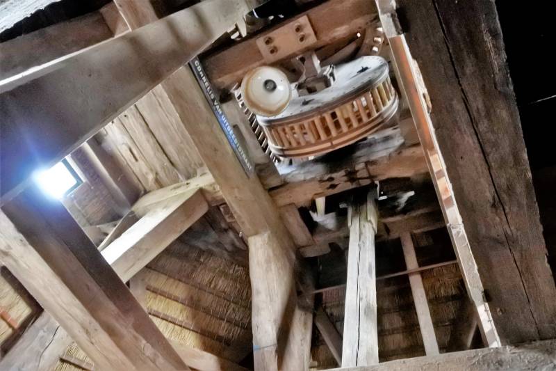 Even verderop zien we een hoge stellingmolen. Het blijkt molen De Rat, een houtzaagmolen van al ruim driehonderd jaar oud en anderhalve eeuw terug vanuit Zaandam naar IJlst overgebracht. De molen wordt door vrijwilligers en met subsidie van de gemeente in bedrijf gehouden. Wij mogen de molen van binnen bekijken en het is interessant om de grote tandraderen en de imposante balken te zien die al meer dan driehonderd jaar hun werk doen. Helaas is er vandaag te weinig wind dus gaat een demonstratie aan onze neus voorbij. Na de bezichtiging vervolgen we onze wandeling en slingeren langs de Geeuw naar de zuidzijde van Sneek. Daar versperren de A7 en een recent gegraven kanaal onze weg zodat we flink moeten omlopen voordat we het centrum naderen en de bekende waterpoort in zicht komt. De poort heeft thans geen functie meer, maar vanuit de poort hebben we wel een prachtig uitzicht. Als wij er zijn dient zich juist een grote rondvaartboot zich aan die een haakse bocht moet maken om zicht door de vlakbij de waterpoort liggende brug te wurmen. Het laatste stuk van onze tocht gaat door het gezellig drukke centrum van Sneek, waarbij het jammer is dat de winkels van de grote Nederlandse winkelketens afbreuk doen aan het eigen karakter van de stad.