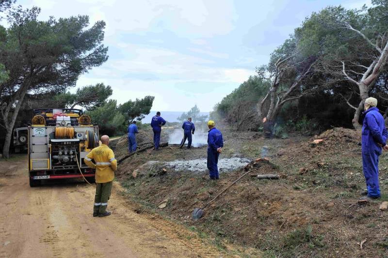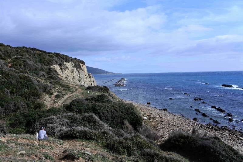 Eenmaal weer op de route lopen we door een groen landschap geleidelijk omhoog, waarbij ook het nu weer een traject is dat door de regen van de afgelopen tijd slecht begaanbaar is. Het hoogste punt van de wandeling ligt op ongeveer driehonderd meter, wat mooie uitzichten over de Spaanse kustlijn en Afrika aan de overkant van het water oplevert. Weer wat lager gaat het rotspad over in een zandpad en lopen we geleidelijk het duingebied binnen. De natuur heeft hier het zand tot op ongeveer tweehonderd meter boven zeeniveau opgestuwd, wat niet van vandaag op gisteren zal zijn gebeurd.
